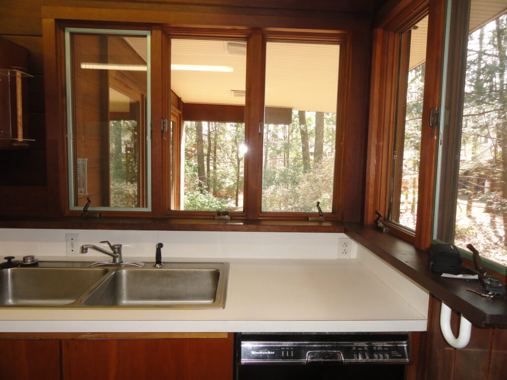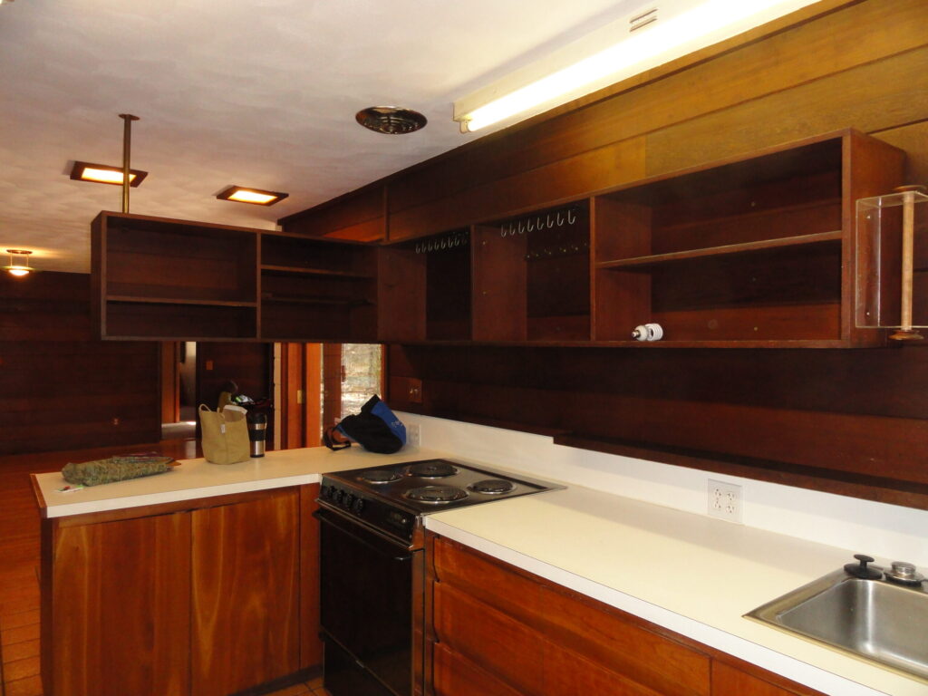 Photos from 2011-2012 below. Cherry cabinets below, original wood paneling (cedar or redwood?) above. Fluorescent light tubes and electric range visible on the left. On the right, the old KitchenAid dishwasher that we replaced, and in the window, the reflection of one of the fluorescent light tubes!