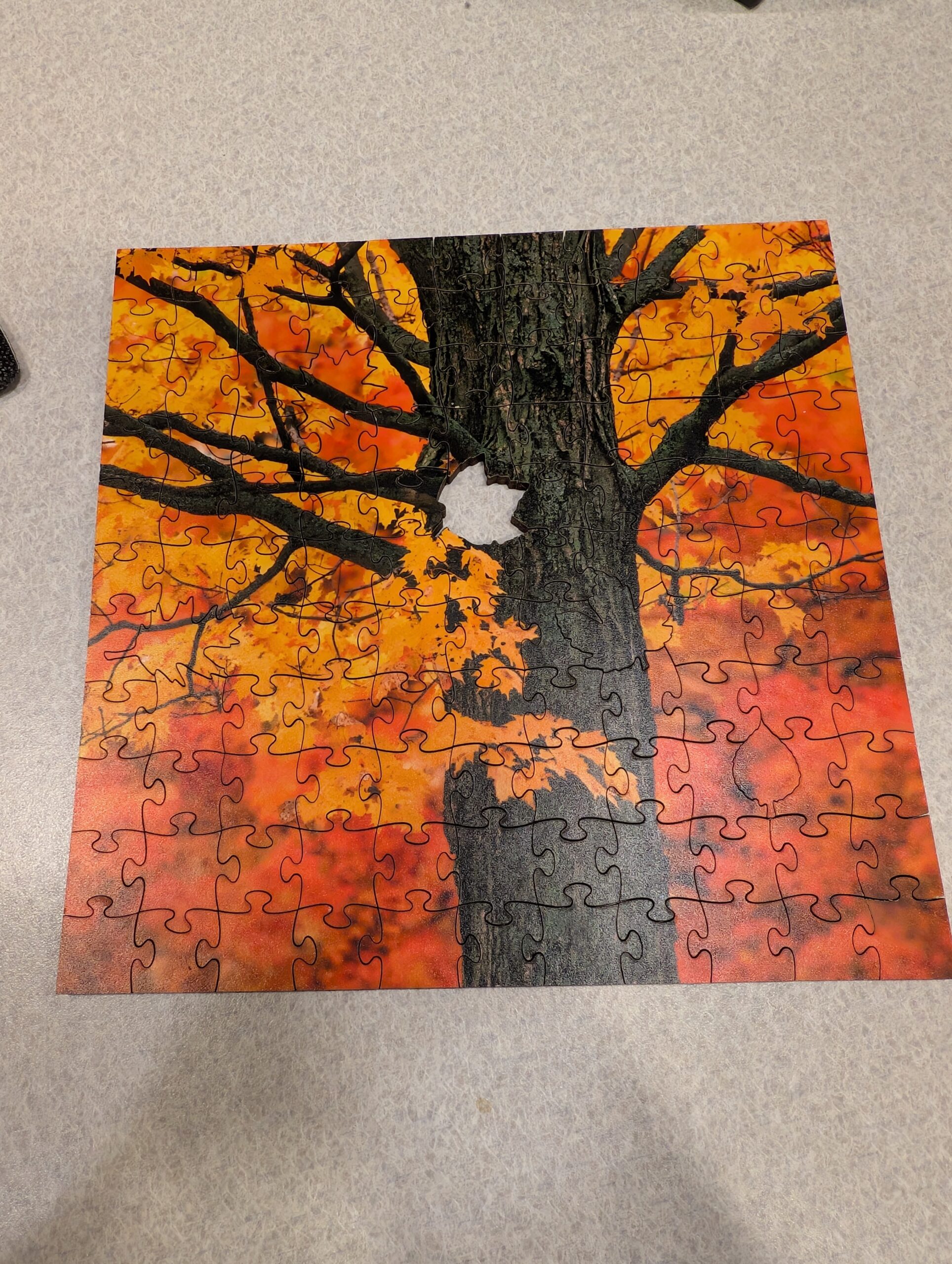 I learned about LouBud from Rebecca Tushnet, of course, and was immediately drawn to this “Brawlin’ Betties” benefit puzzle — benefiting the Brawlin’ Betties, a Santa Barbara-area roller derby team. LOVED this puzzle — so cute with the cut-outs for the roller skate eyelets, and the quite elegant “BB” logo. A keeper! Not hard, at that piece count, but with the blocks of solid blue, and the cut-outs, it did require a little bit of attention to do. Loubud makes sparkling wine (not champagne, since it’s not from Champagne, France…) & wooden puzzles! The website lists Laura and Paul Hughes and there appears to be a PH 7/24 signature on the back of one of the pieces ….