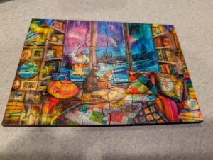 I think it’s fair to say that the decline in democracy in this country has made it difficult for me to do jigsaw puzzles. But Ash and I still manage to knock out a small one periodically. The small puzzles from Zen are very doable even in a highly distracted mindframe. “Winter Reading Nook” is a work by Aimee Stewart, who I’ve seen on a lot of puzzles. This particular puzzle was a 47-piece teaser, available from Zen Puzzles.