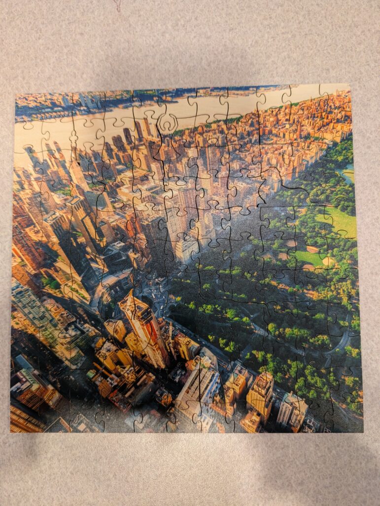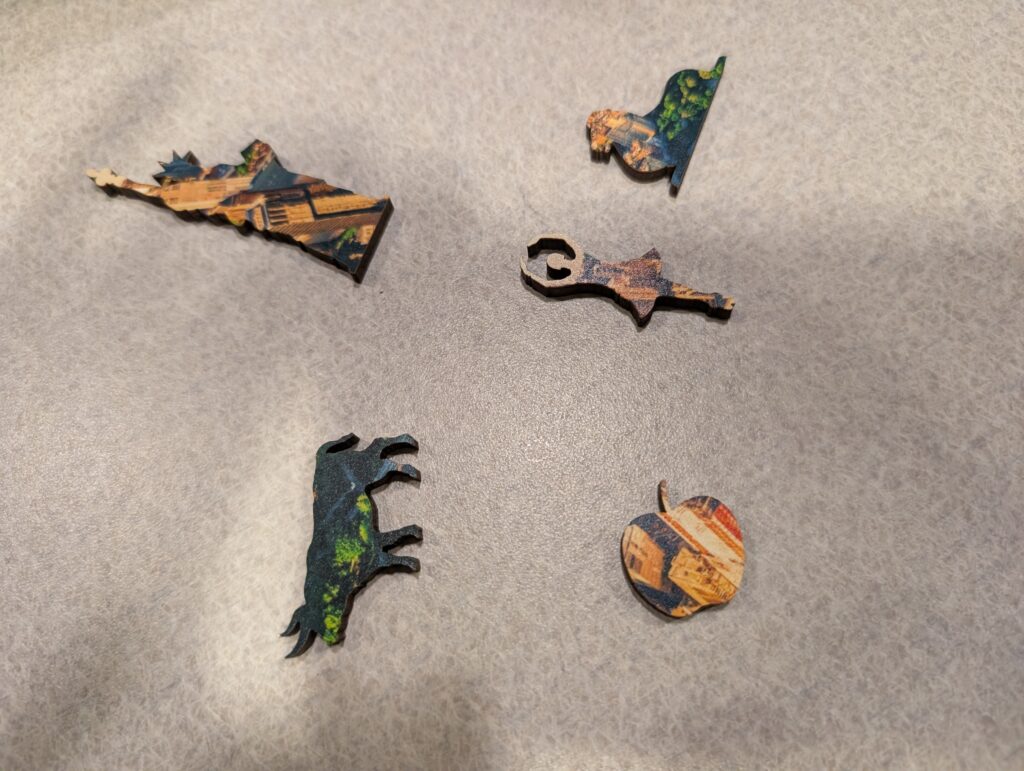 The Zen Puzzle website describes the cow whimsy as the “bull of Wall Street”, which goes to show that they made this puzzle before Trump crashed the markets in a fit of stupidity, malevolence, or greed, or a frothing mix of all three. I do wish that Zen would have shared the artist’s name, which is not on the puzzle or on the website, and honestly I’m too tired from <waves hands> everything to go and ask.