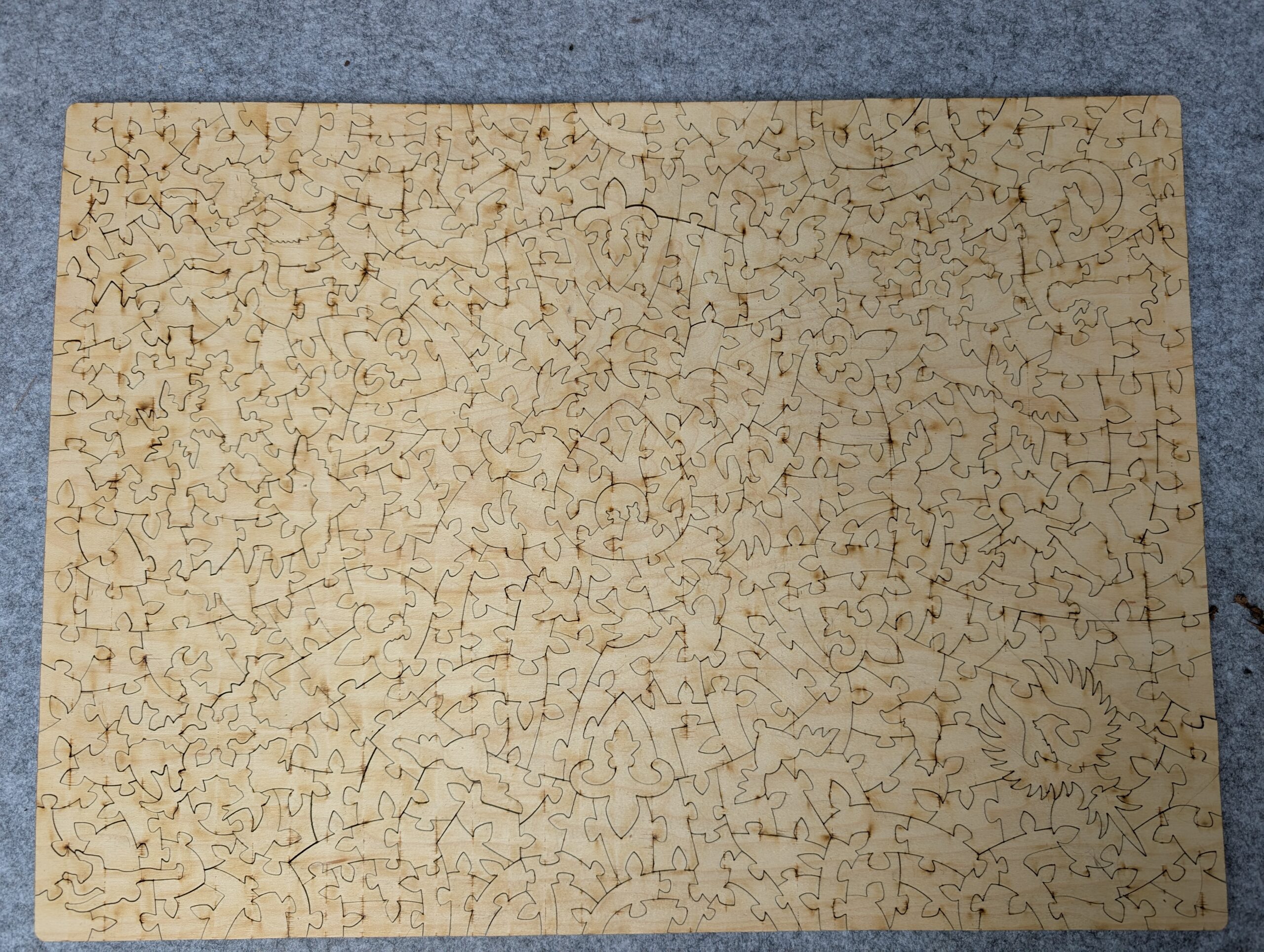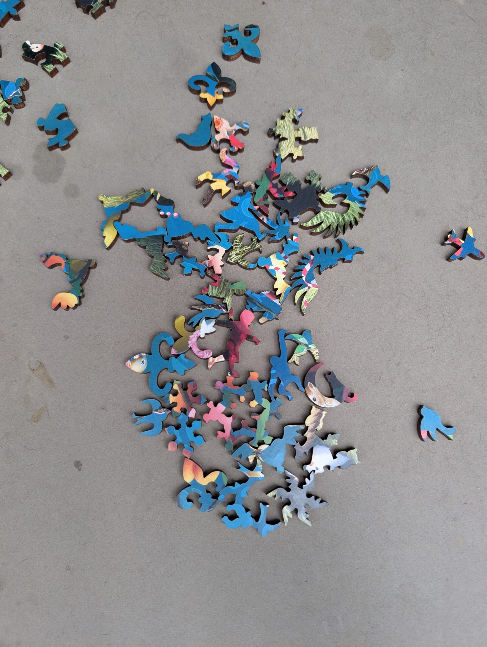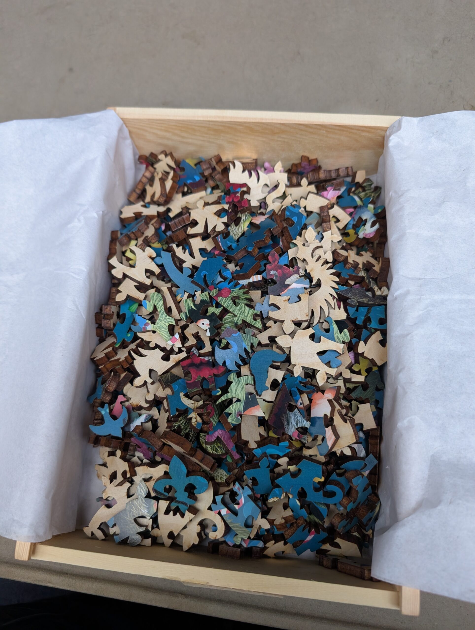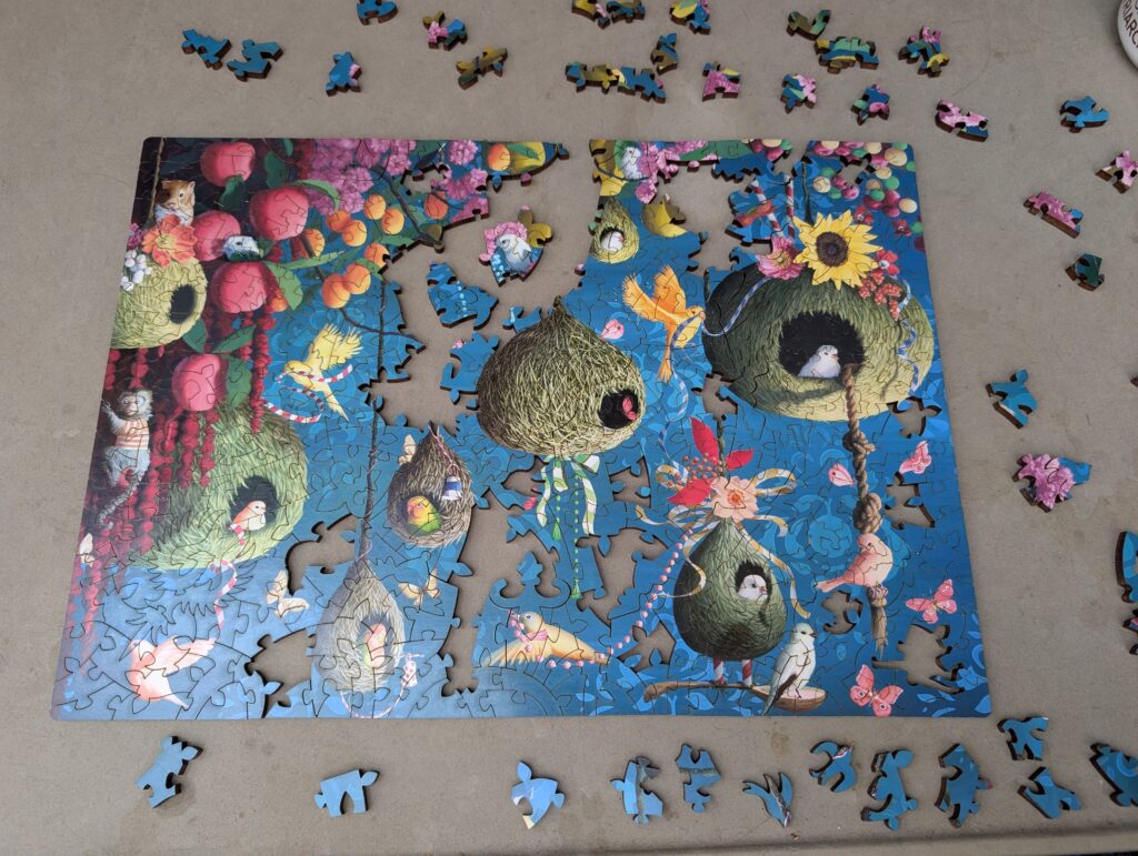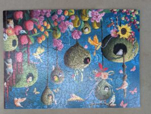 This is the second of a batch of three puzzles I borrowed from Yael. It was a steady, not difficult, solve, with lots of different areas of variously colored fruits, various textures on the animals, beads & ribbons, all on a damask-style background. (Looking at Gauthier’s website, I see that in other paintings too — the formal background both makes the front images pop, and gives them a bit of a surreal flavor. The effect puts me in mind of the 3d lenticular picture books from the 1970s.)