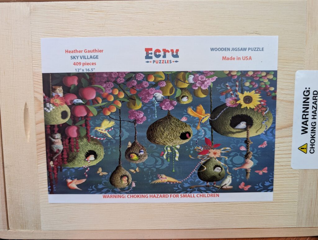 A 409 piece wooden jigsaw puzzle of the lush Sky Village painting by Heather Gauthier. This is from our Ecru line, so the image is matte, and the puzzle is extra beautiful. The puzzle is average hard with a straight edge, irregular piece shapes, leaf and knob connectors, and decorative whimsies. Puzzle design by Tara Flannery. … 12″x16″