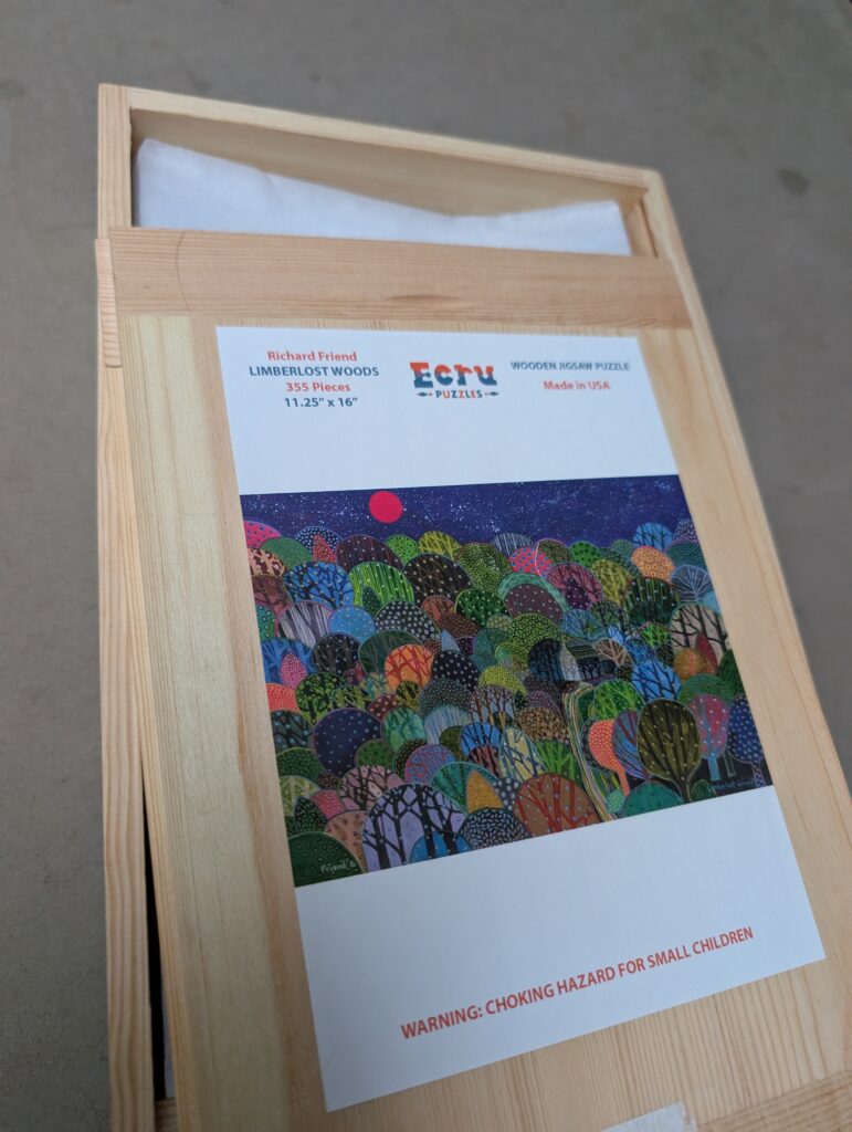 This was a 355-piece puzzle from Ecru (Artifact), “Limberlost Woods” by Richard Friend. 11.25″x16″; Artifact notes: