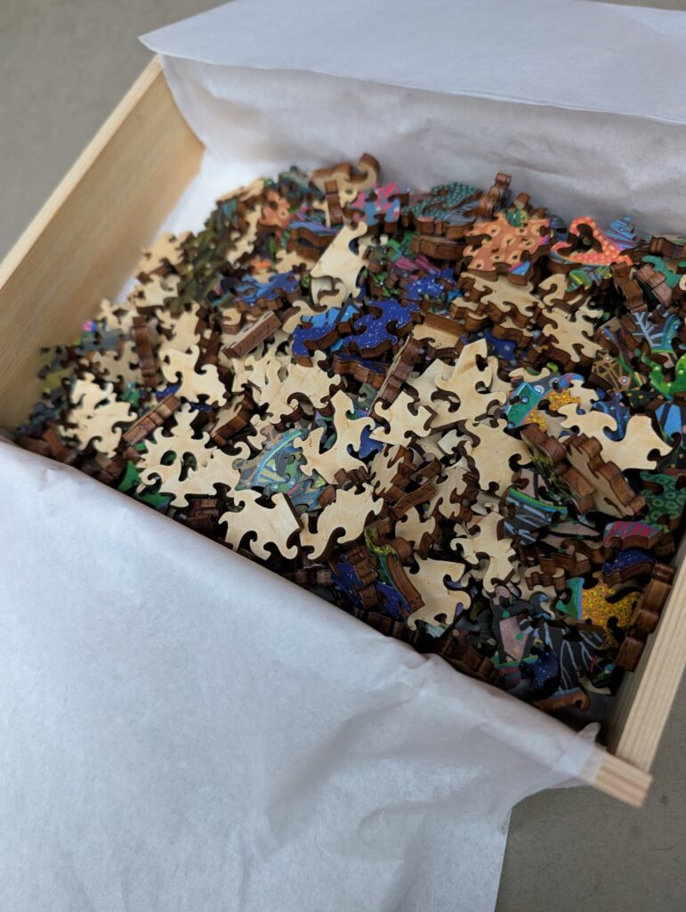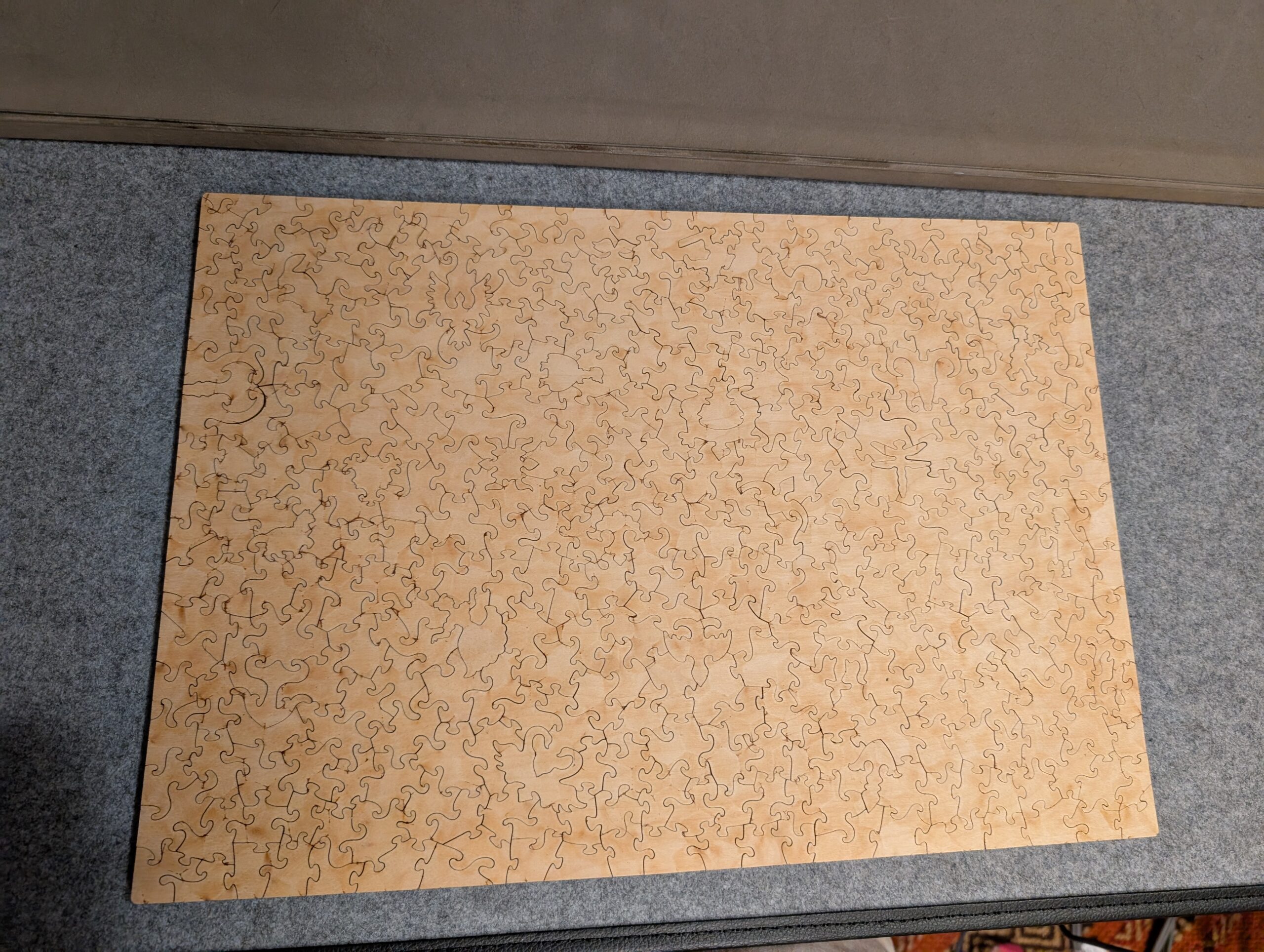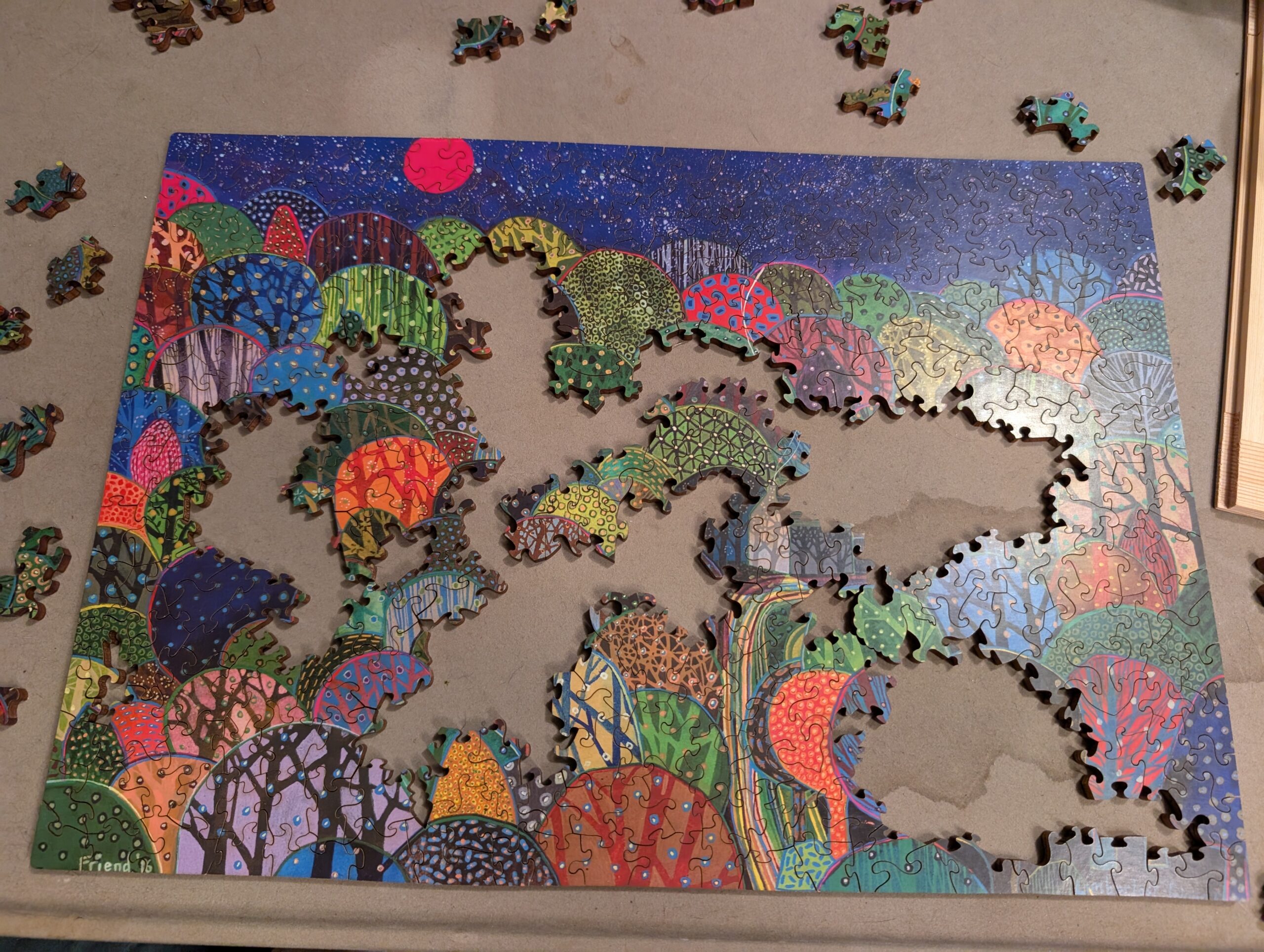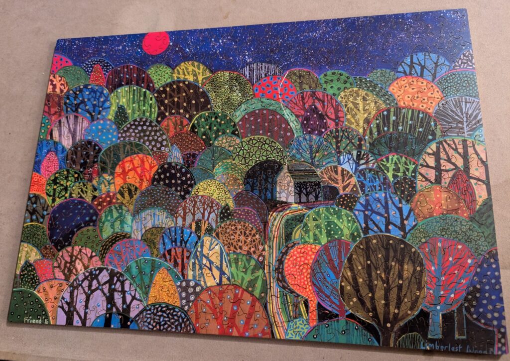 The third of three Artifact / Ecru puzzles that Yael loaned to me. The image looks initially a bit overwhelming, but all the trees have distinct patterns (a small number of repeats) that it made it easy and fun to assemble small pieces, and then match edges to other pieces.