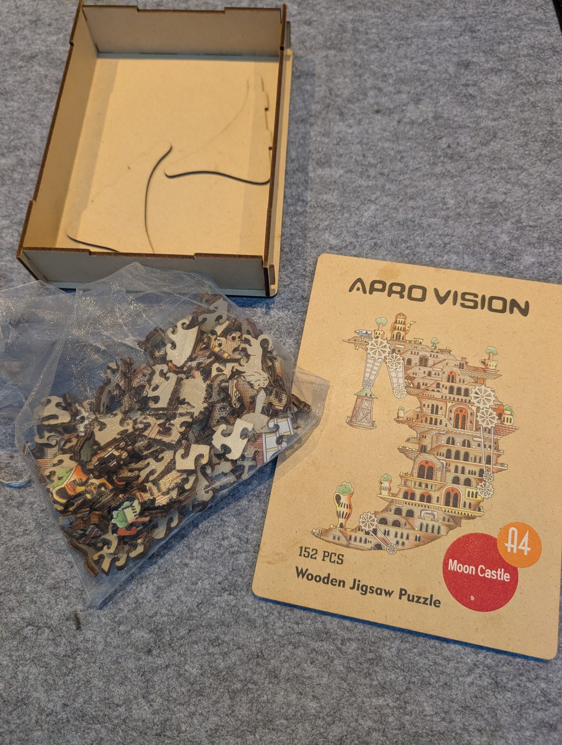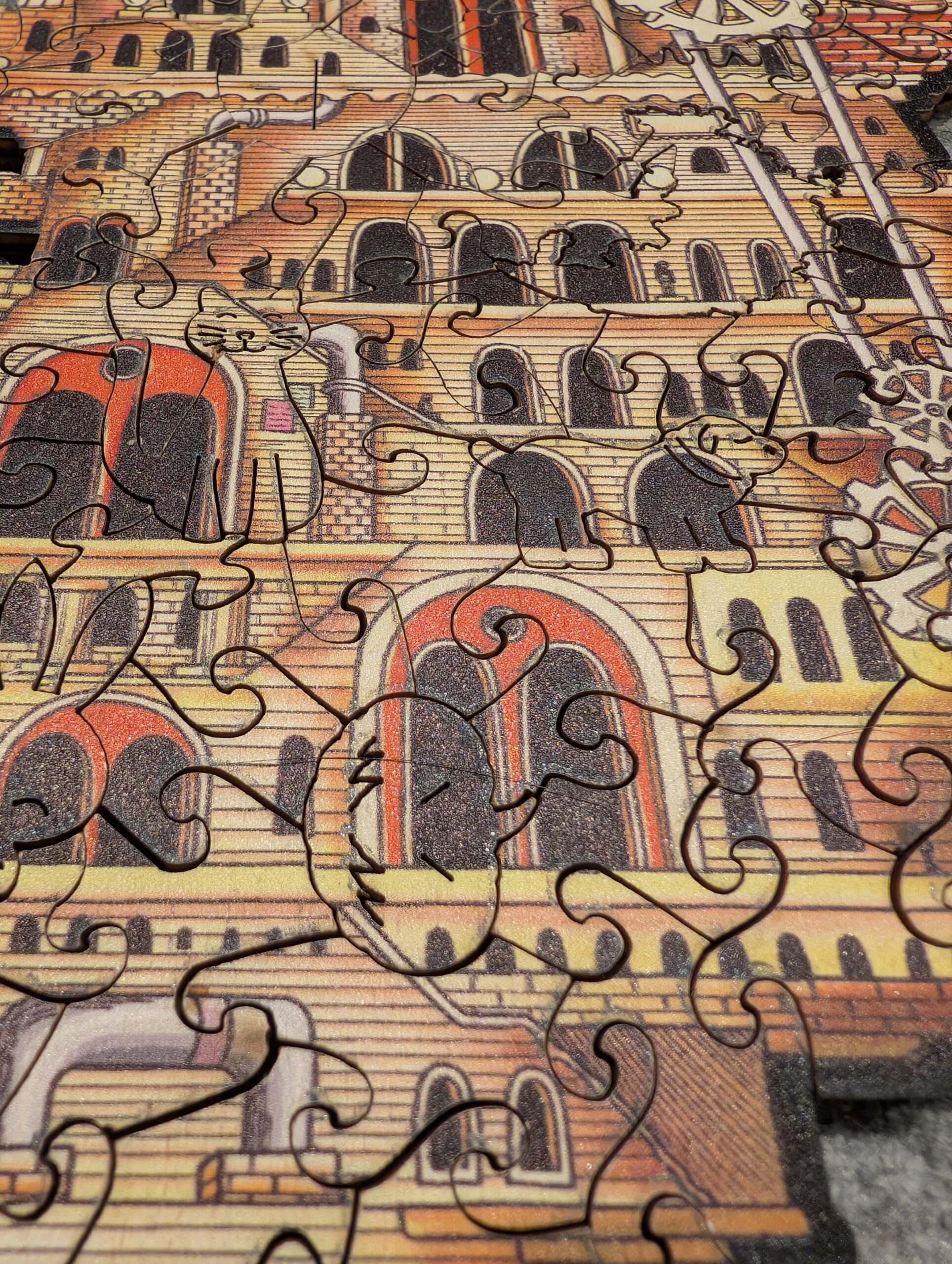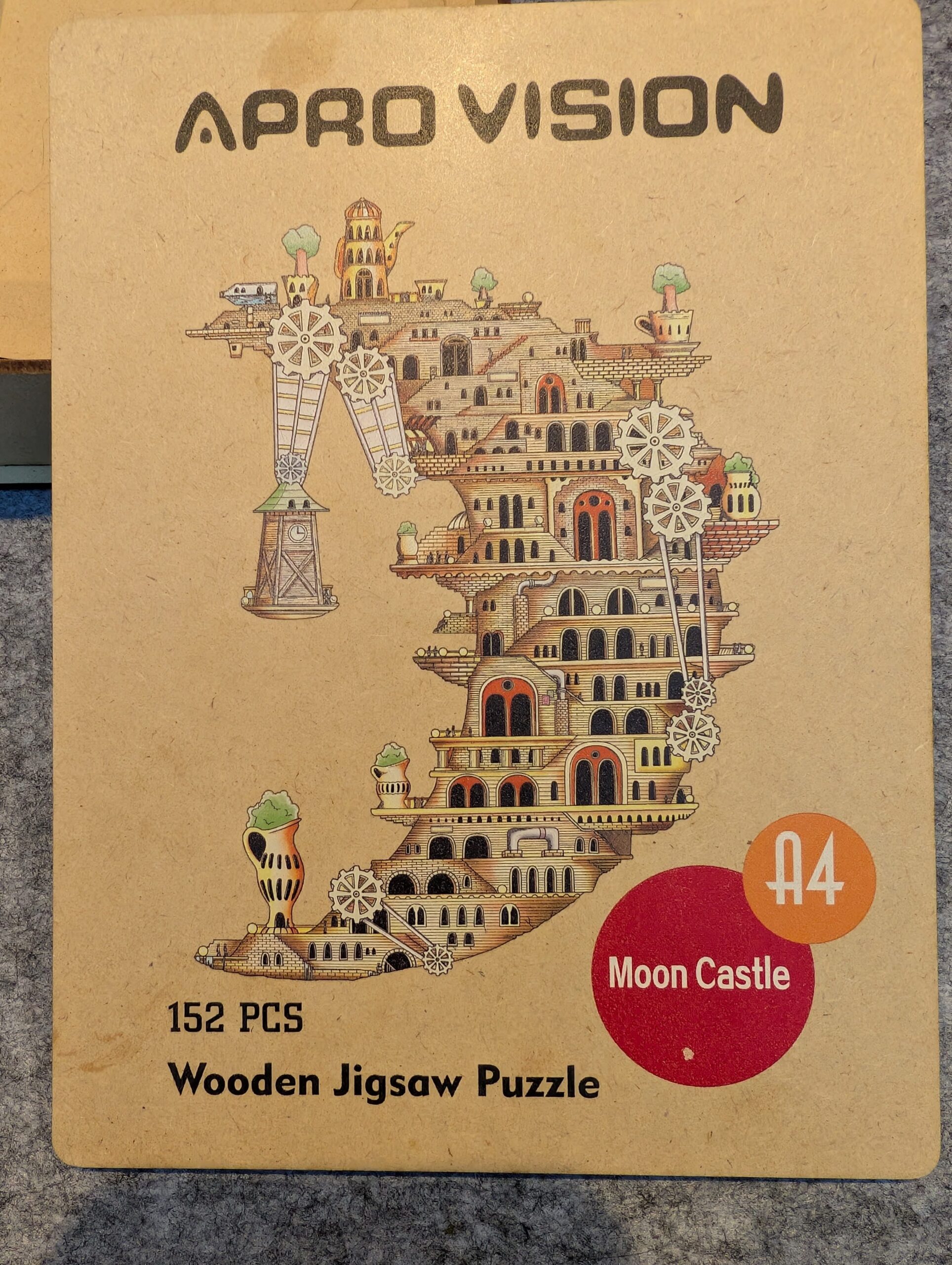 Via Hoefnagel, I got this laser-cut 152-piece (“A4 size”) puzzle from “Apro Vision”, which appears to be one of the randomly generated names that Chinese laser cutters create to sell on Amazon. It’s a pretty cool and tricky image — many little doors in various sizes, plus some gears, and trees in various teacups (surrealist steampunk?). The cut was also trickier than I expected, with a fair number of non-unique connections. The connectors were a sort of curlicue, which also made it trickier to solve. The whimsies were cute (although as usual for this kind of laser-cutter, there are a lot of “cute” whimsies that are not particularly connected to theme, thrown in with the others). On the minus side, thin wood, lots of push fit connections, and the art is probably AI. There was so much push-fit, in fact, that I didn’t even try to flip it over.