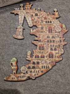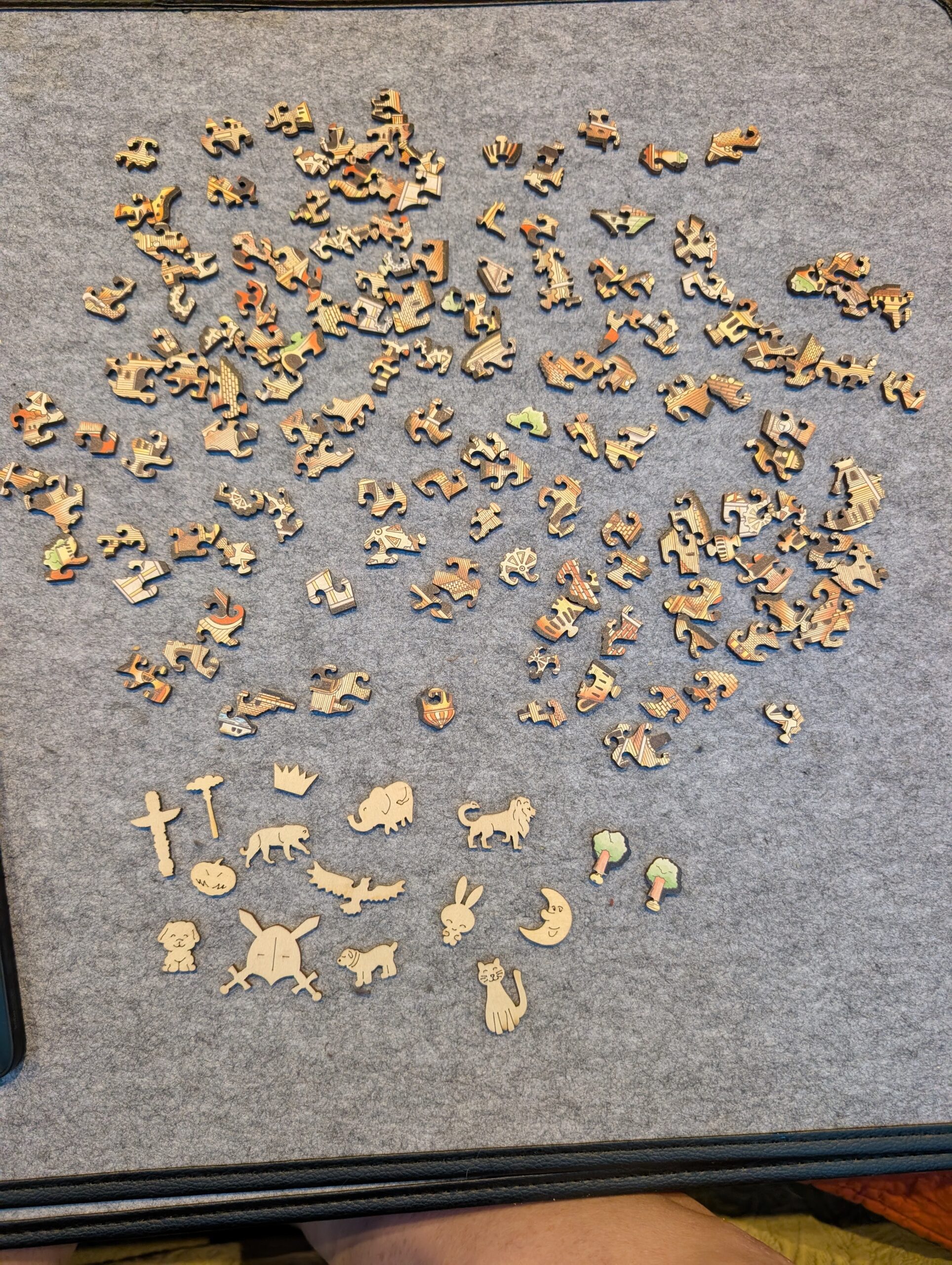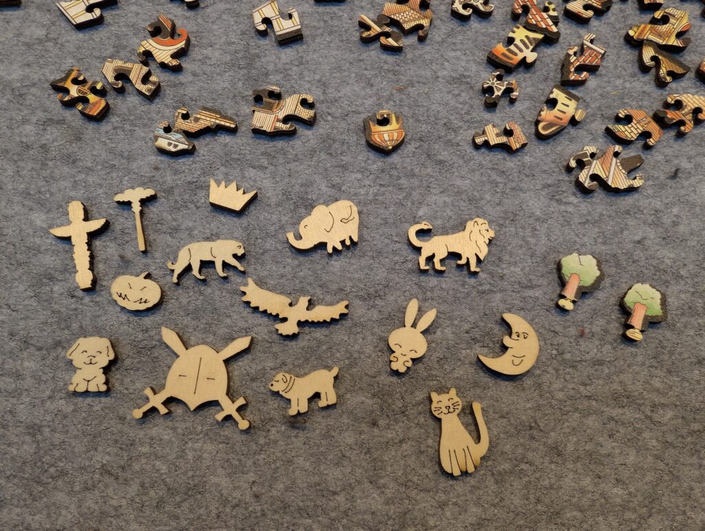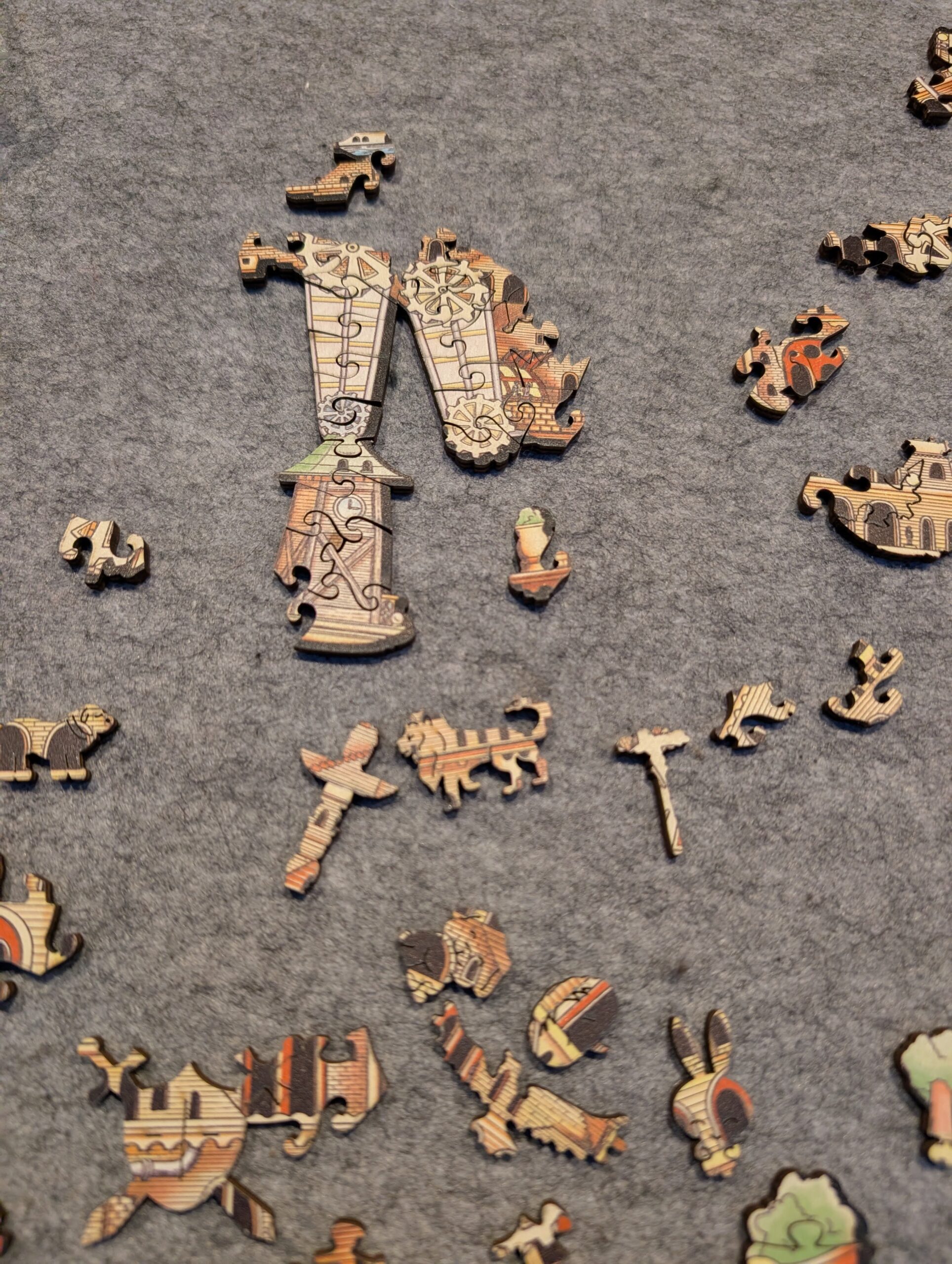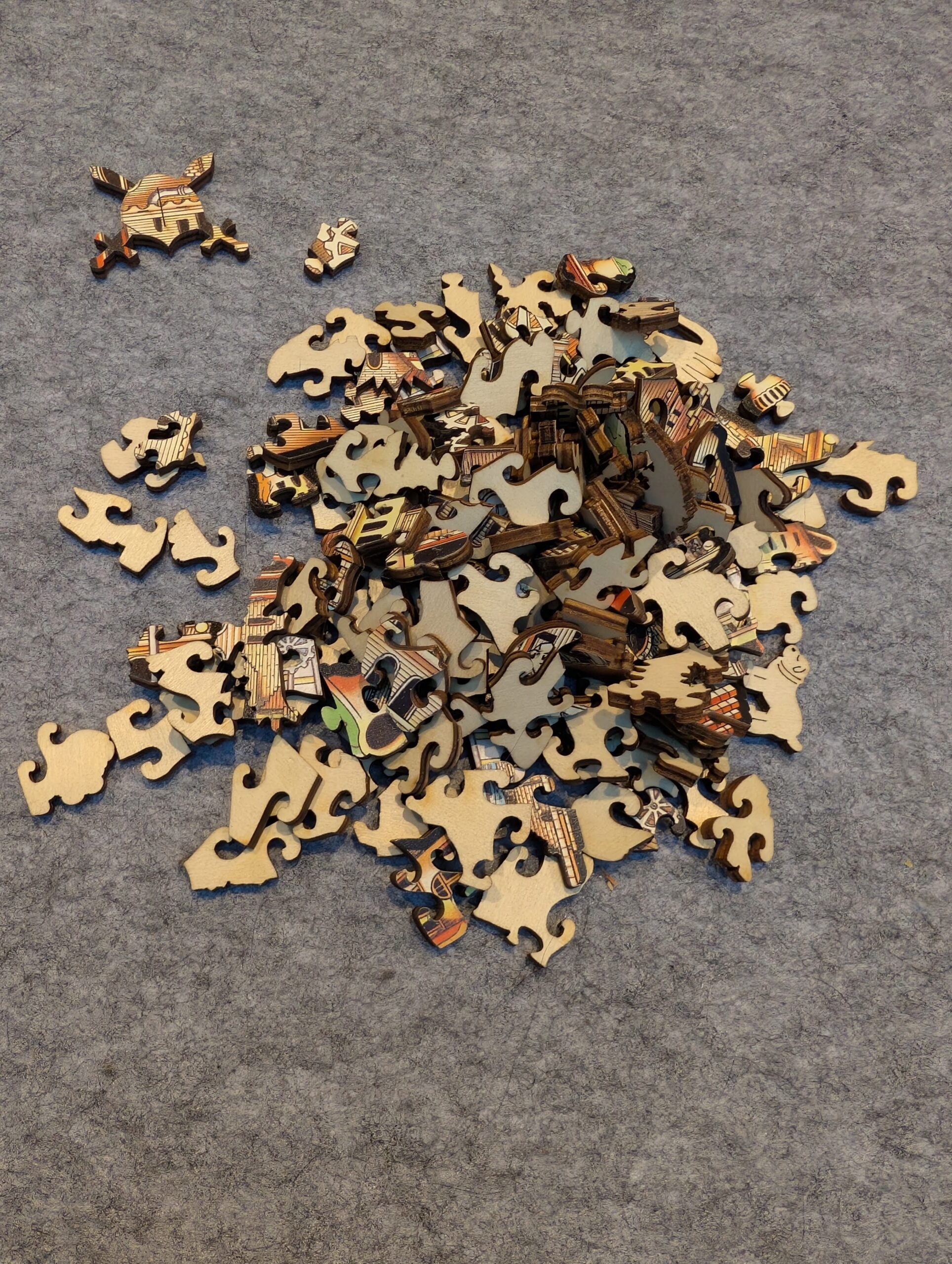 Via Hoefnagel, I got this laser-cut 152-piece (“A4 size”) puzzle from “Apro Vision”, which appears to be one of the randomly generated names that Chinese laser cutters create to sell on Amazon. It’s a pretty cool and tricky image — many little doors in various sizes, plus some gears, and trees in various teacups (surrealist steampunk?). The cut was also trickier than I expected, with a fair number of non-unique connections. The connectors were a sort of curlicue, which also made it trickier to solve. The whimsies were cute (although as usual for this kind of laser-cutter, there are a lot of “cute” whimsies that are not particularly connected to theme, thrown in with the others). On the minus side, thin wood, lots of push fit connections, and the art is probably AI. There was so much push-fit, in fact, that I didn’t even try to flip it over.