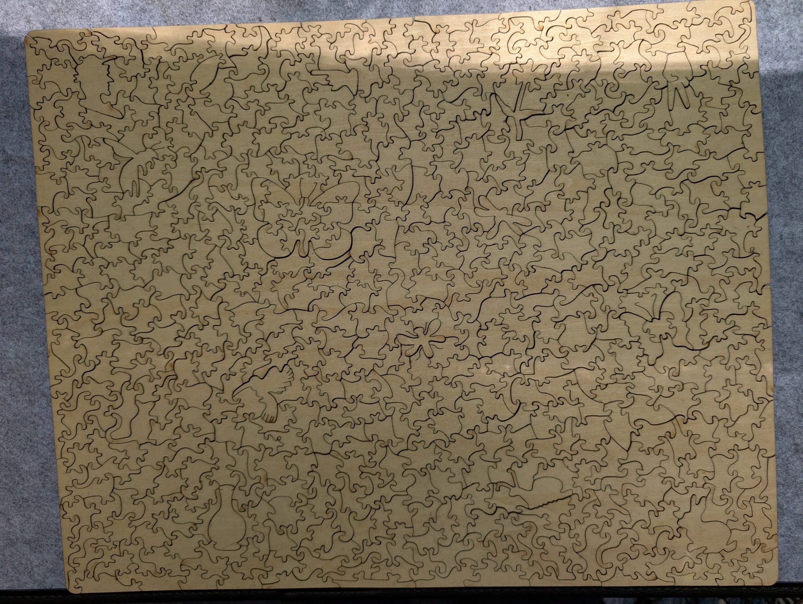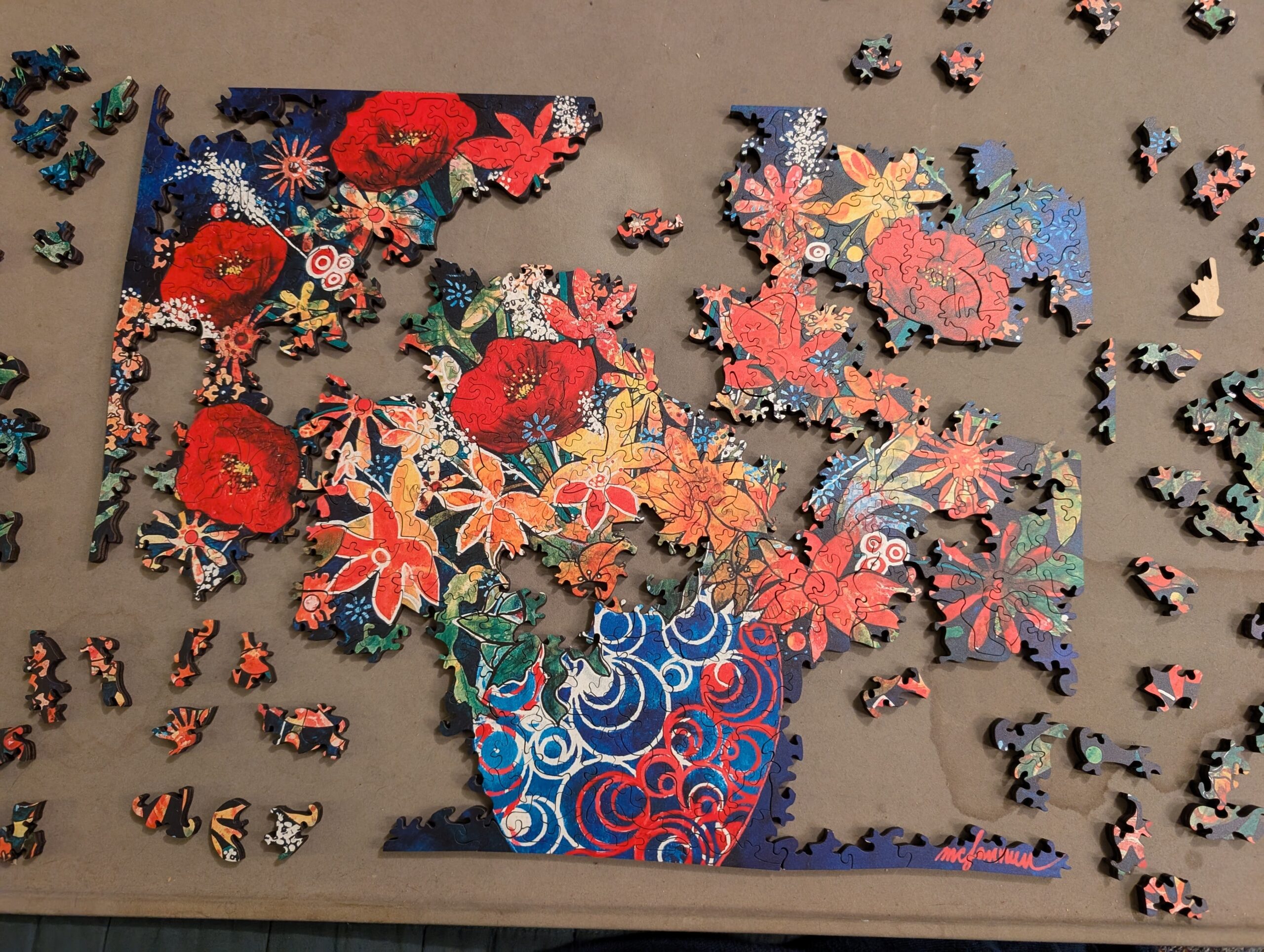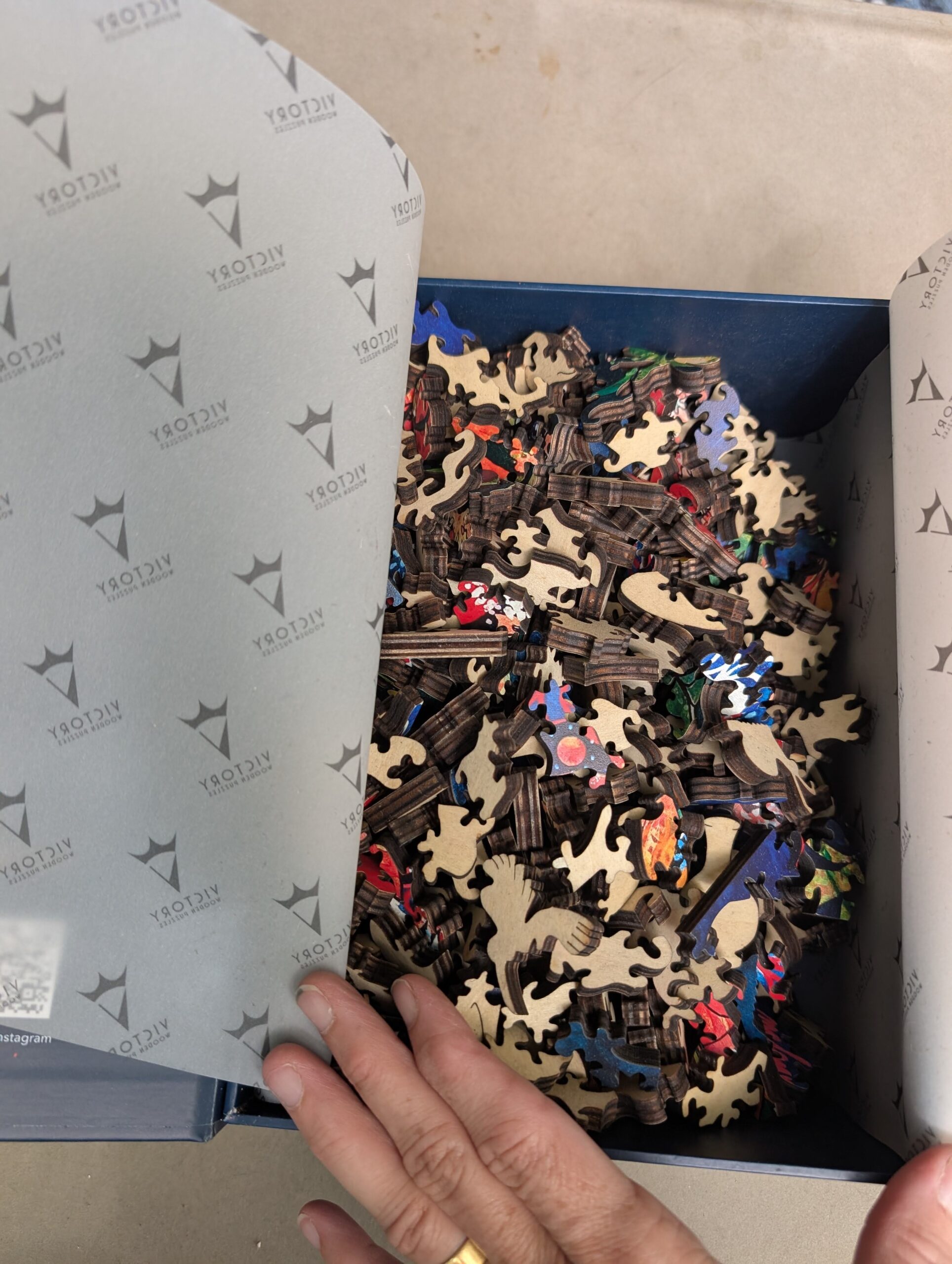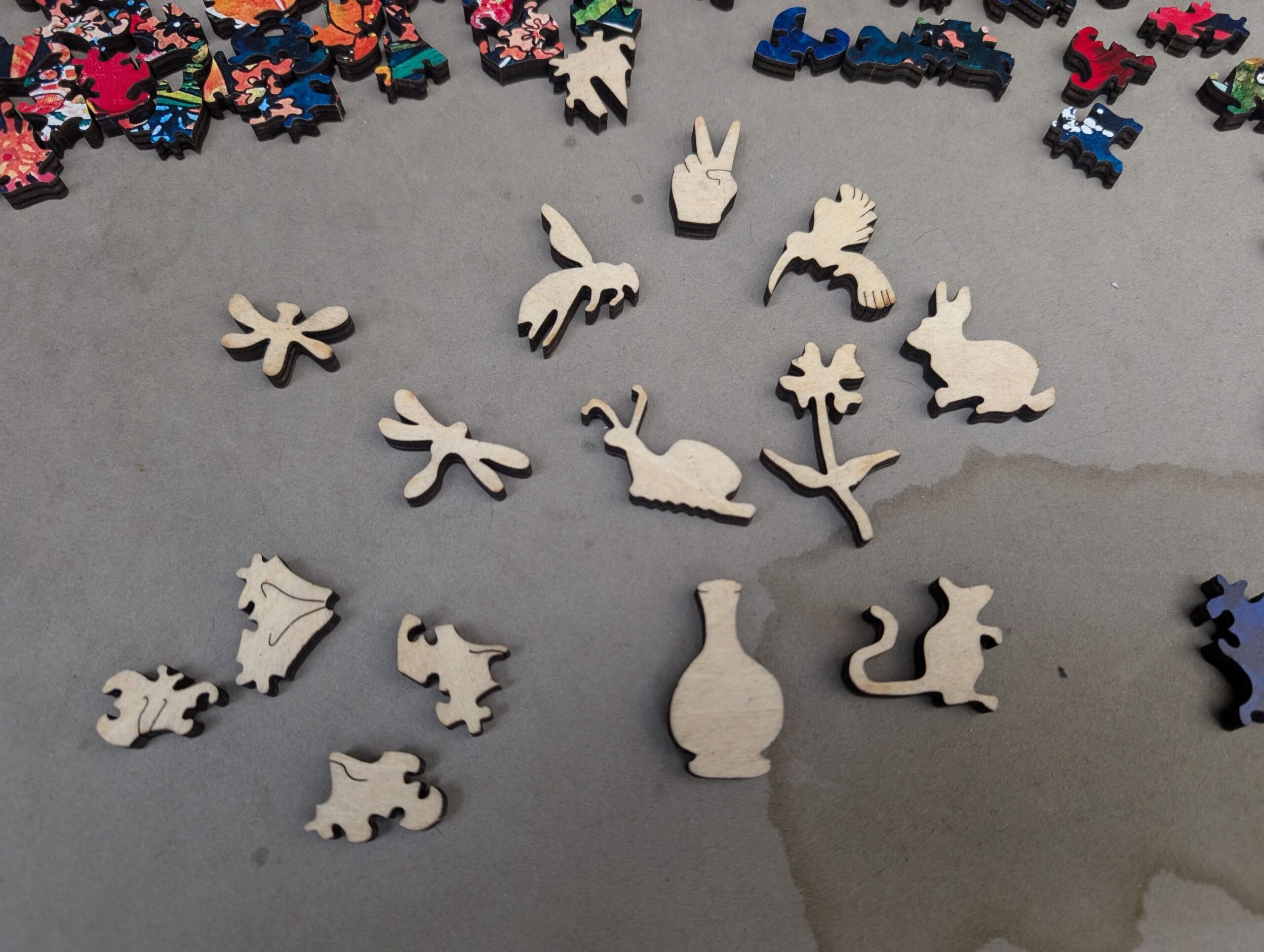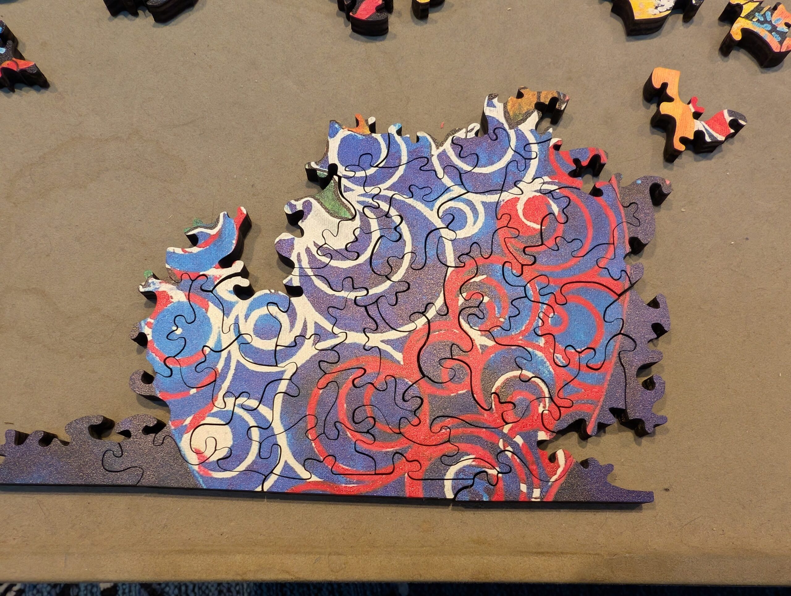 Loving everything about this — the art, which is gorgeous; the puzzle cut, which is tricky and delightful; the feel of the pieces — thick, solid, curvy. They have the sharpness of laser-cut puzzle pieces, but feel solid and sturdy, and just really good in the hand.