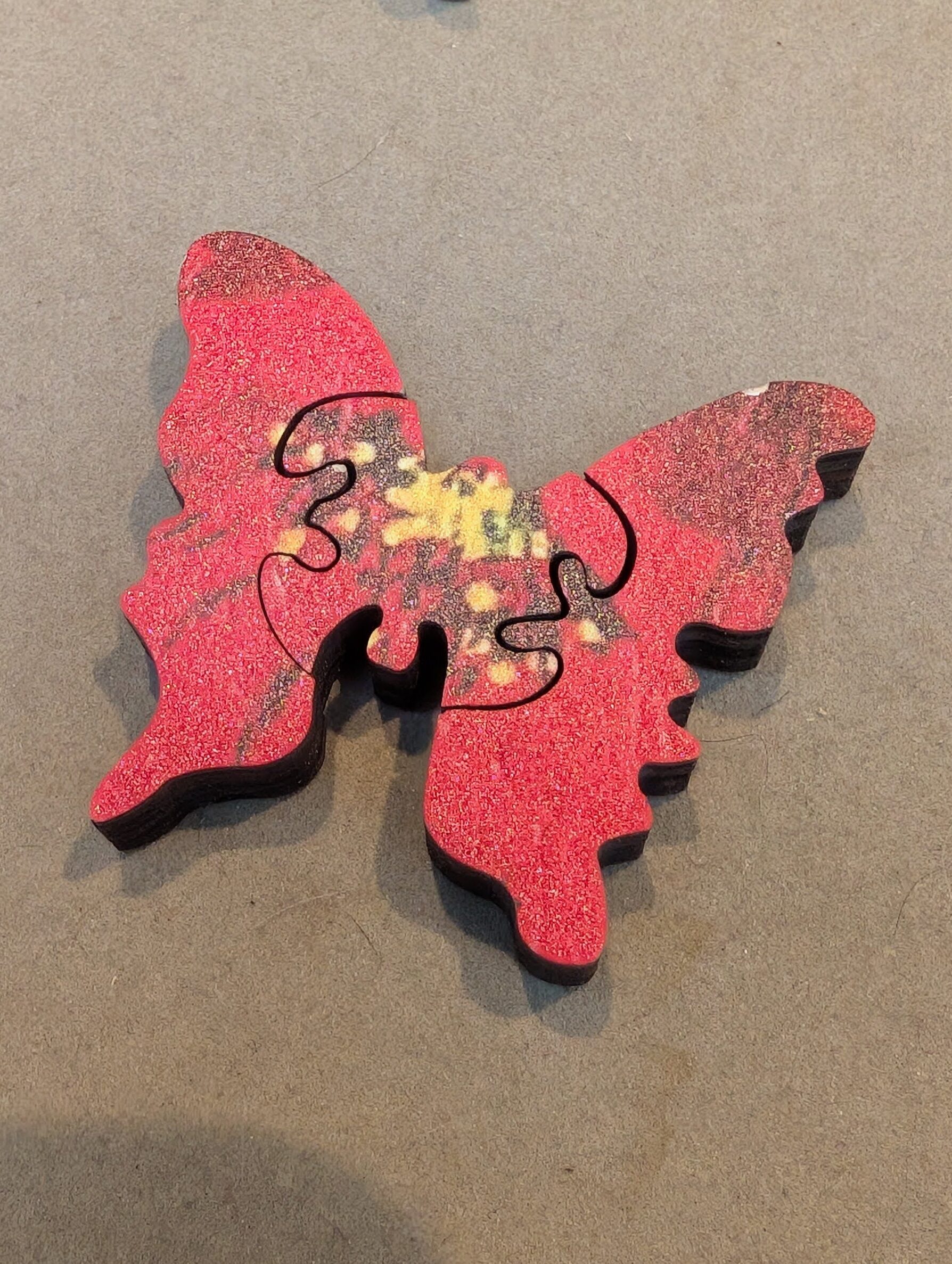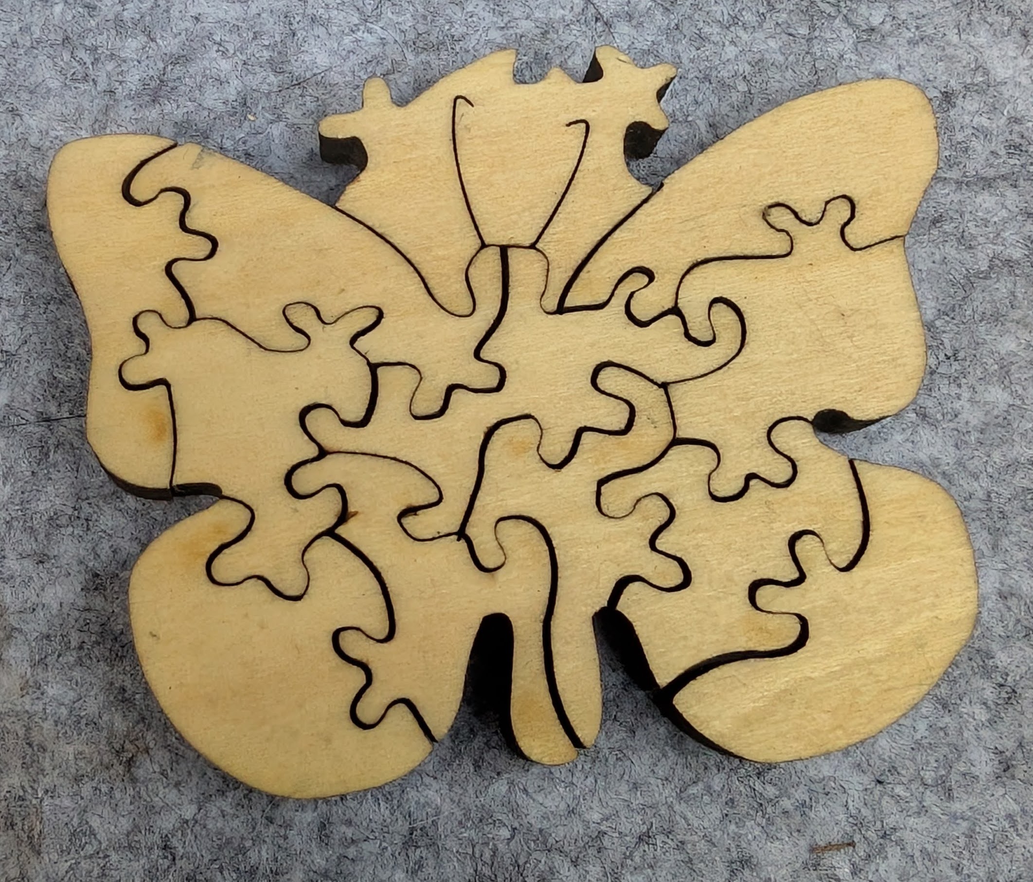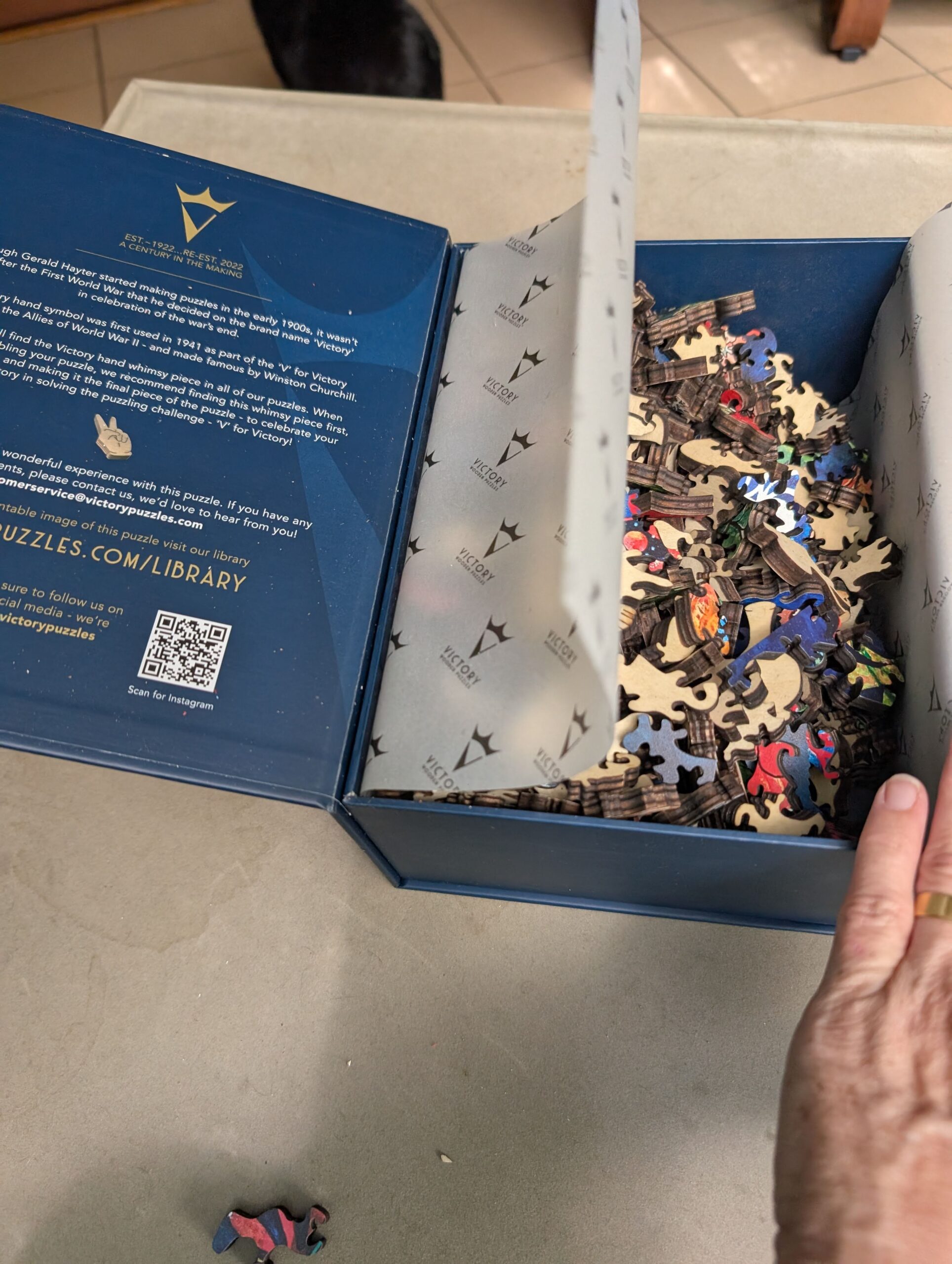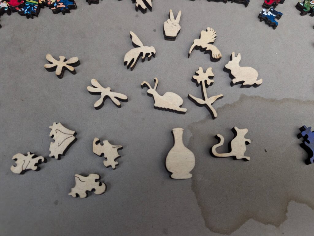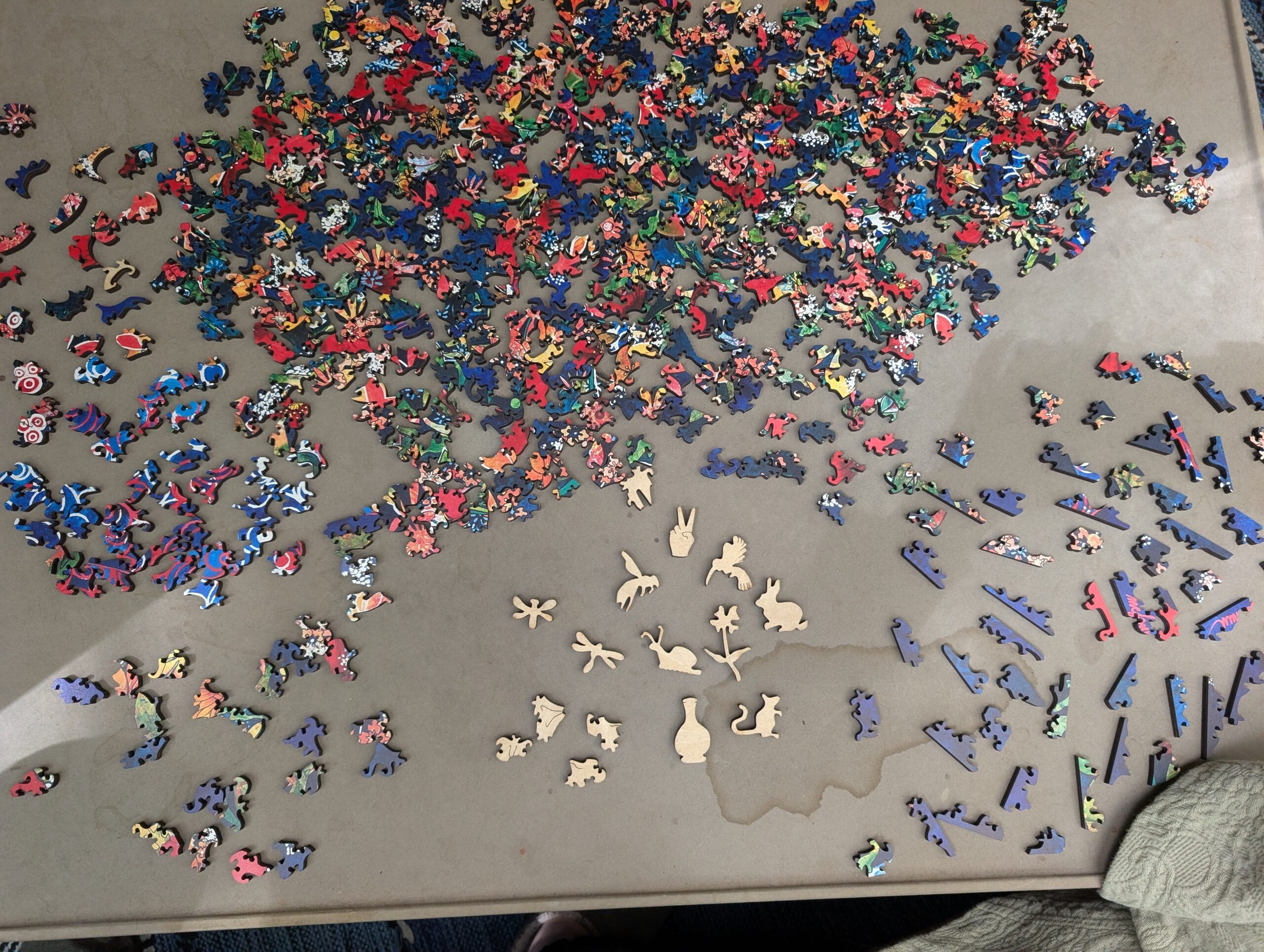 Loving everything about this — the art, which is gorgeous; the puzzle cut, which is tricky and delightful; the feel of the pieces — thick, solid, curvy. They have the sharpness of laser-cut puzzle pieces, but feel solid and sturdy, and just really good in the hand.