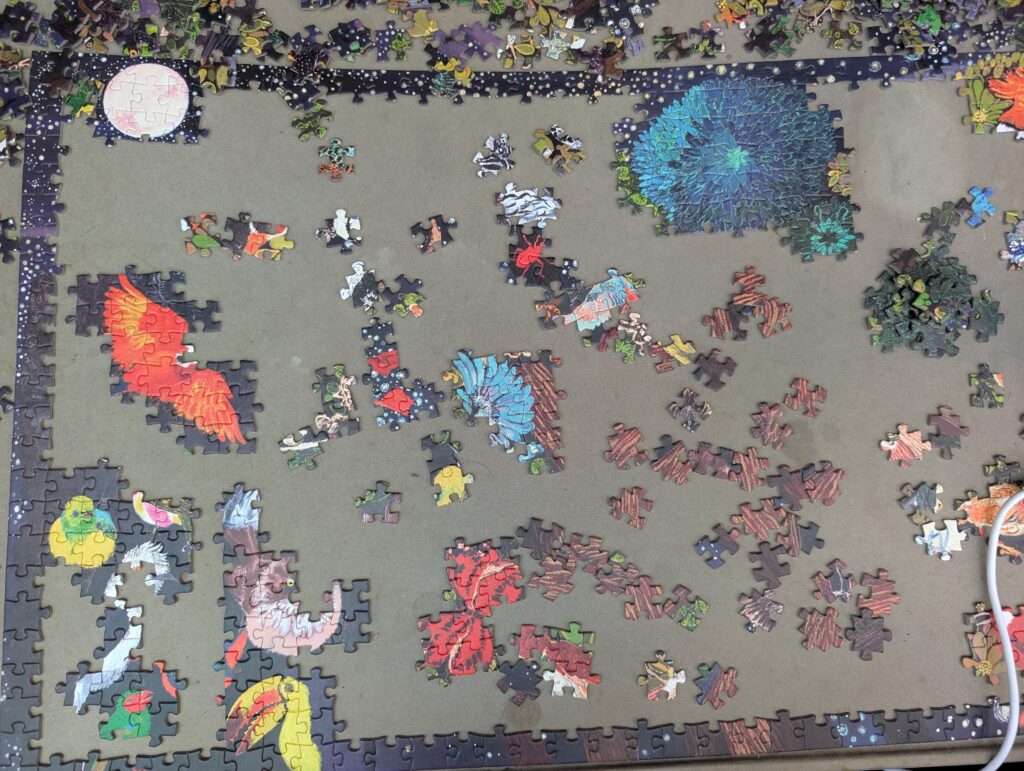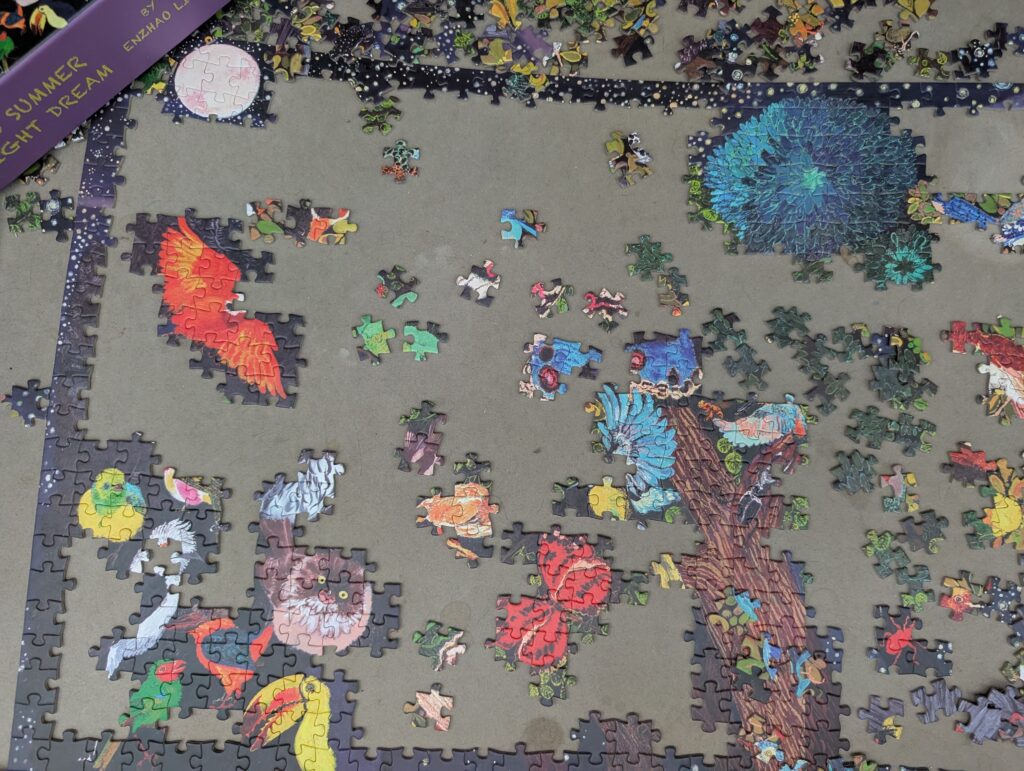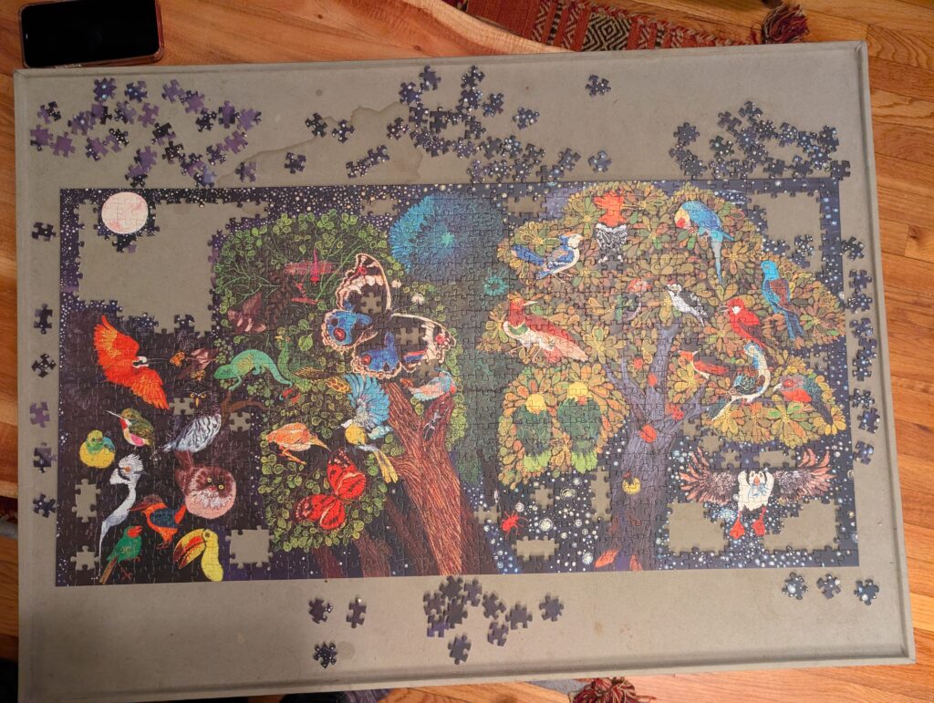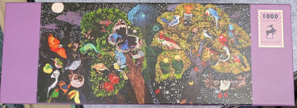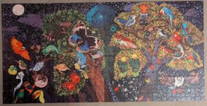 I’d had this 1000-piece puzzle (“Mid Summer Night Dream” by Enzhao Liu) from Antelope for a while, and was leery of doing it because it seemed dark and hard, but actually it came together very quickly and beautifully. There was lots of variation in the various birds and tree forms, and even the night sky had quite distinctive colors and sizes of stars. The Antelope puzzles are a thinner cardboard, but it was a lovely puzzle.