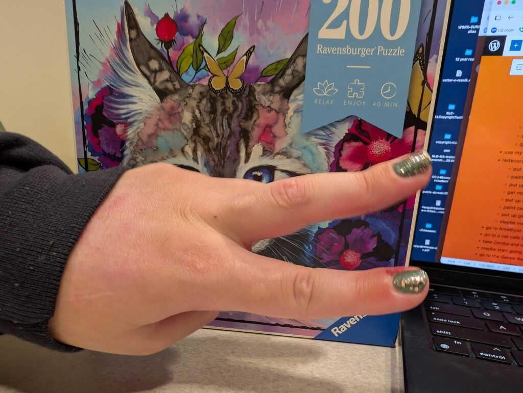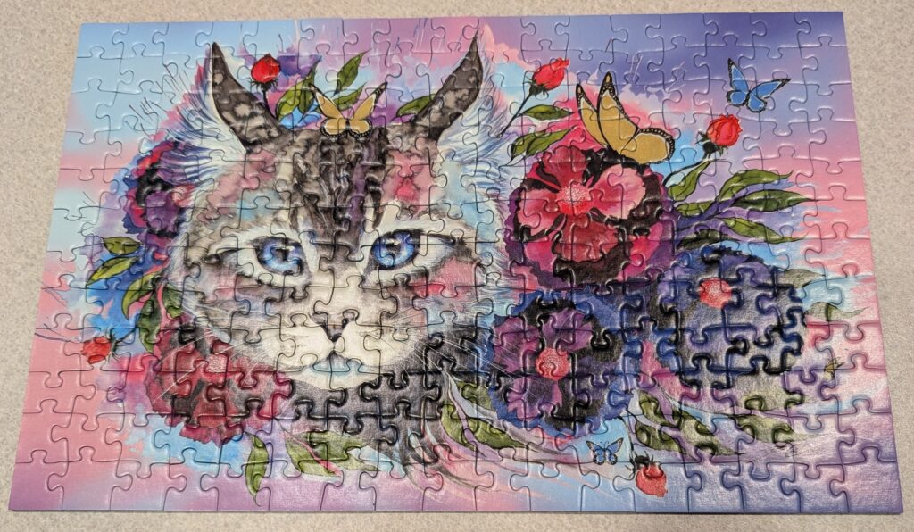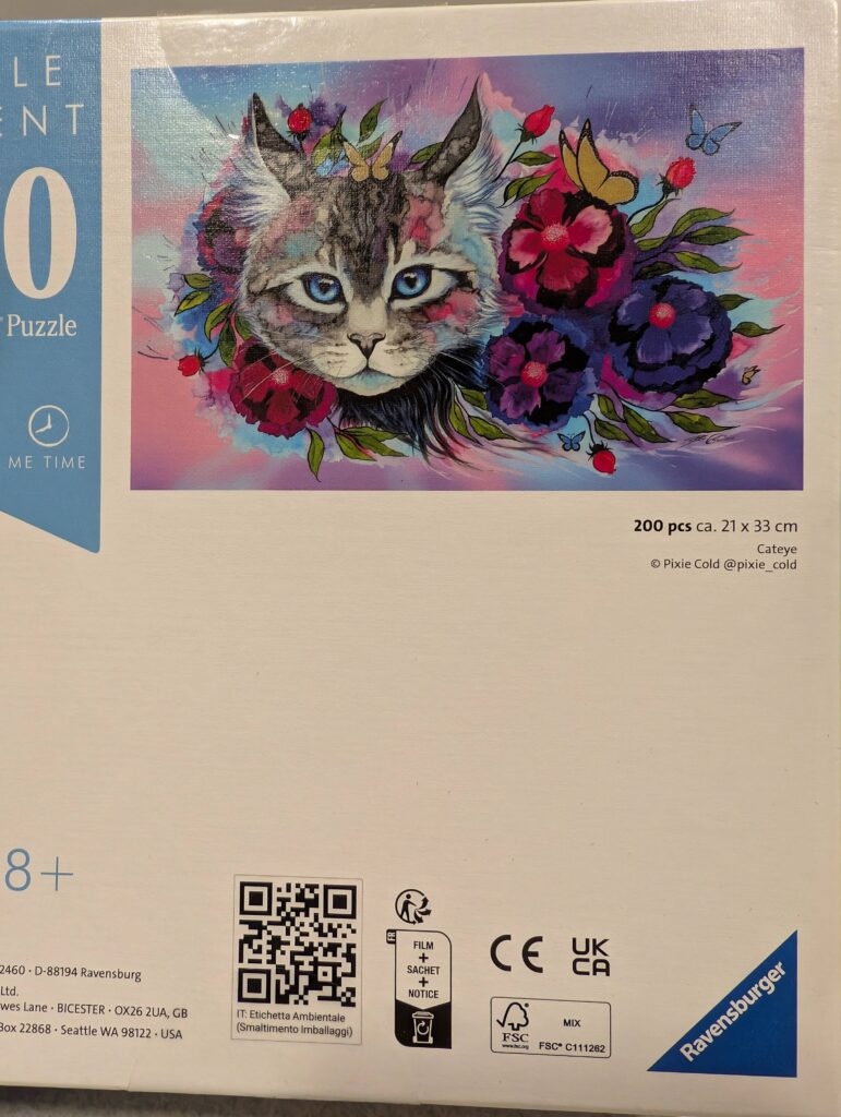 Pretty little 200-piece Ravensburger (“Cateye“) that Ash and I knocked off Saturday afternoon. Most of the pictures on the box made it look more square, so I posted the one picture that had more accurate dimensions — it’s a landscape orientation rectangle! The artist is only credited with an instagram username, “Pixie Cold“, which makes me nervous about AI, but the Instagram feed says “no AI”, so it must be human because instagram account holders are always honest.