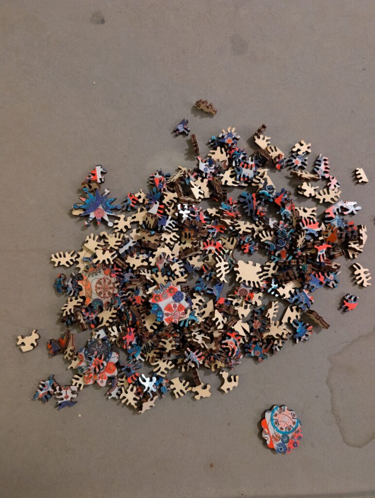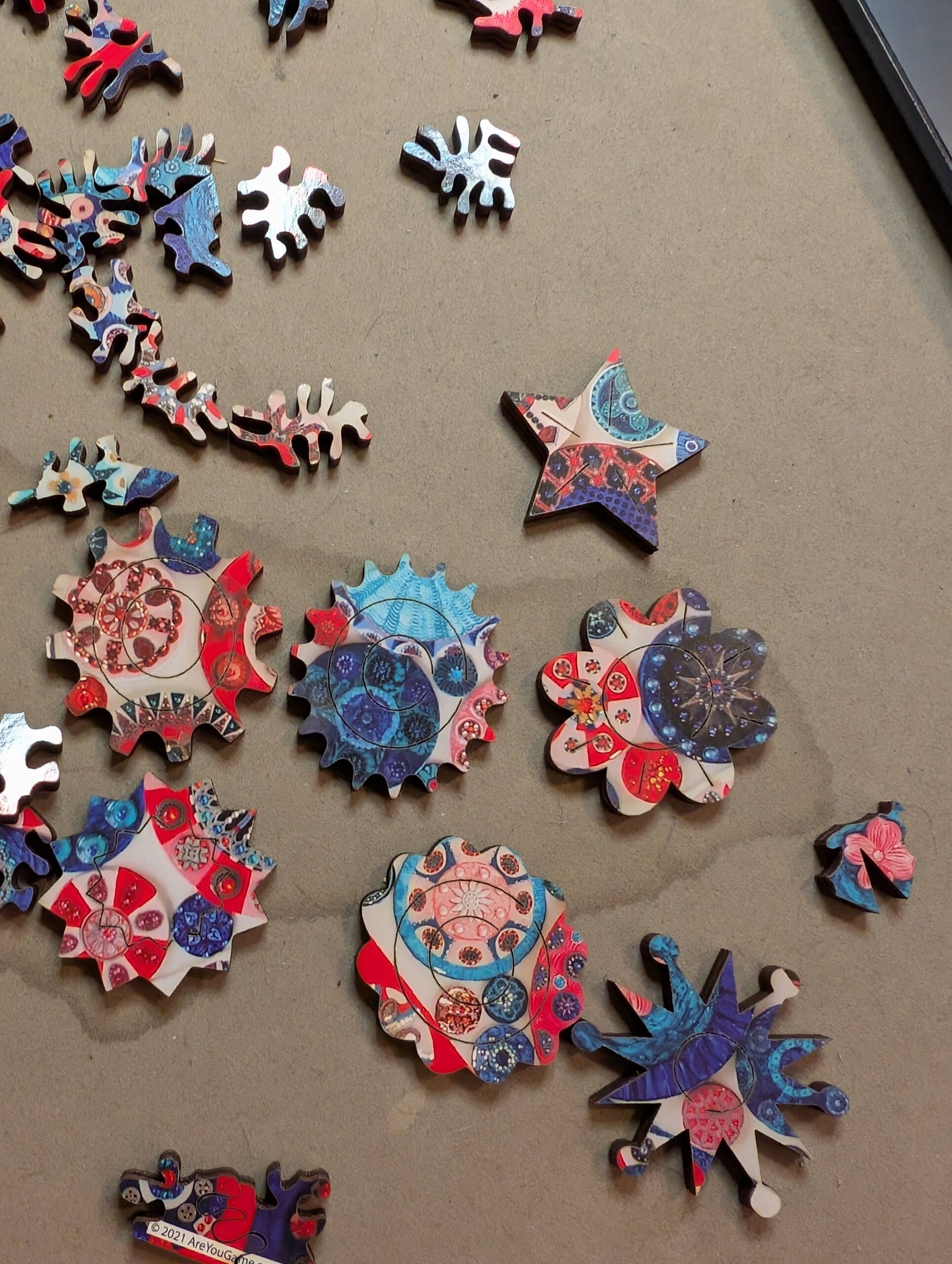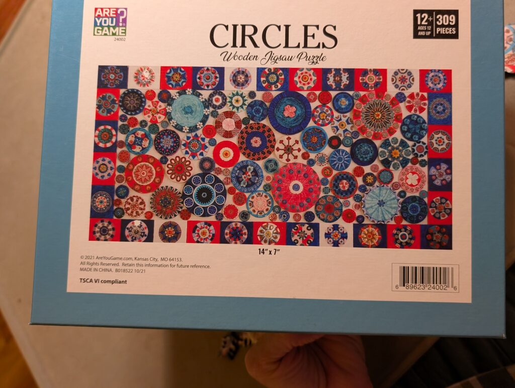 Another of the puzzles from AreYouGame, this one “Circles” by Coral Bourgeois, in 309 pieces. There are not whimsies precisely, but there are some spirograph-like regular shapes embedded.