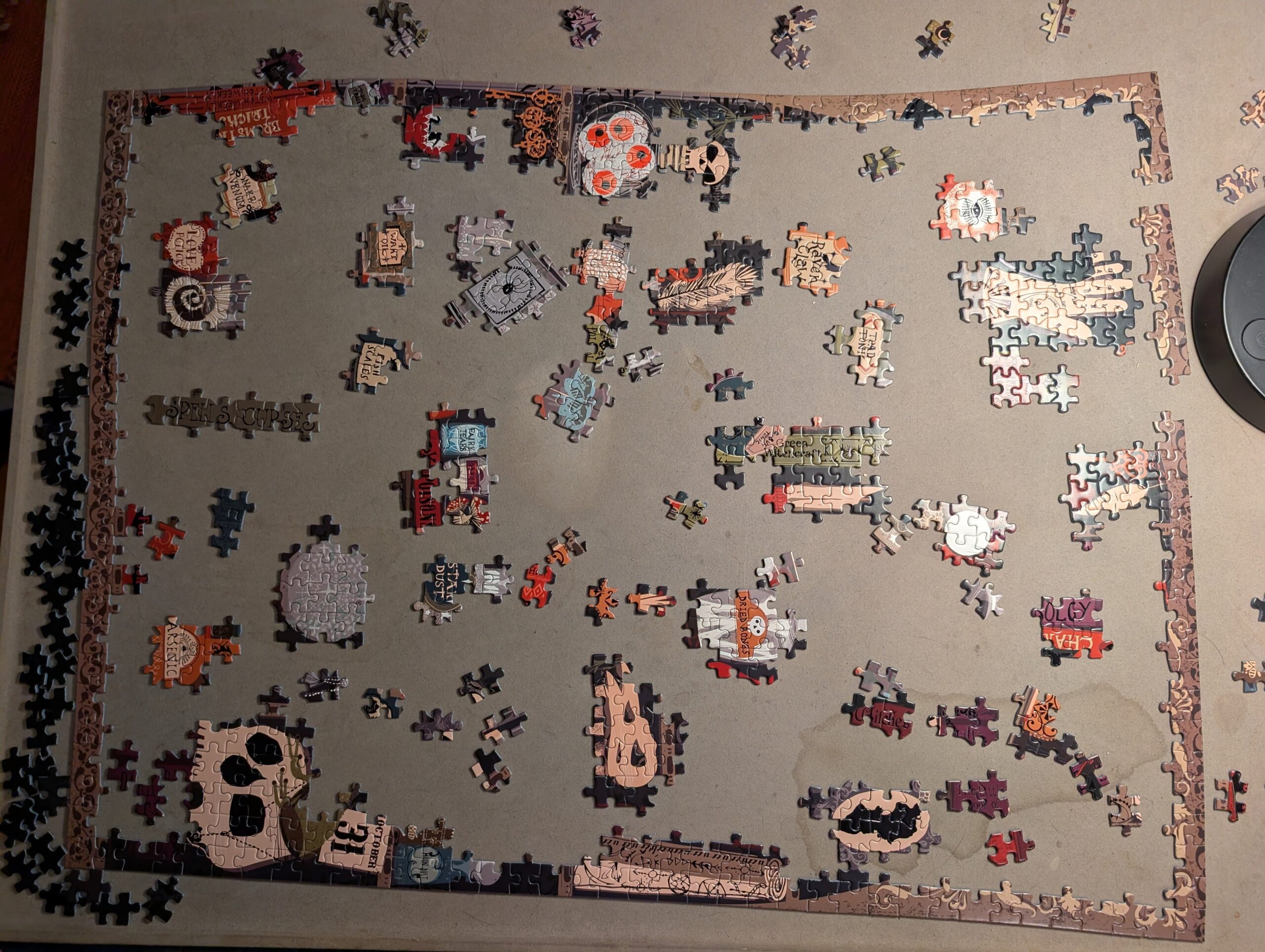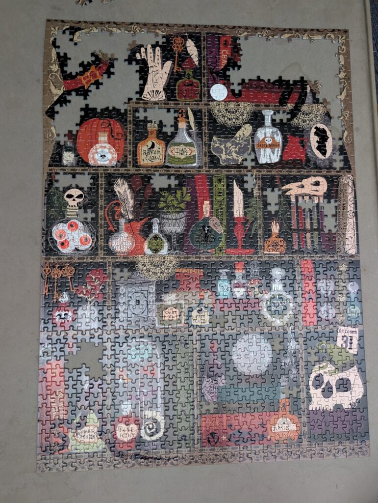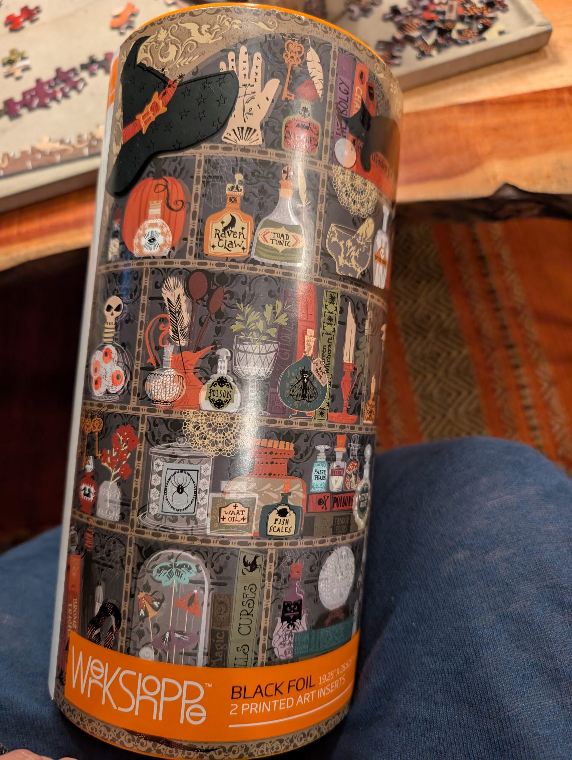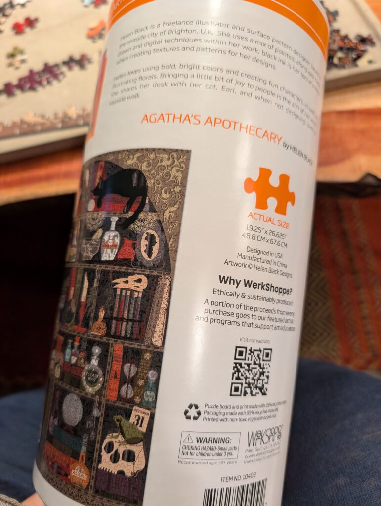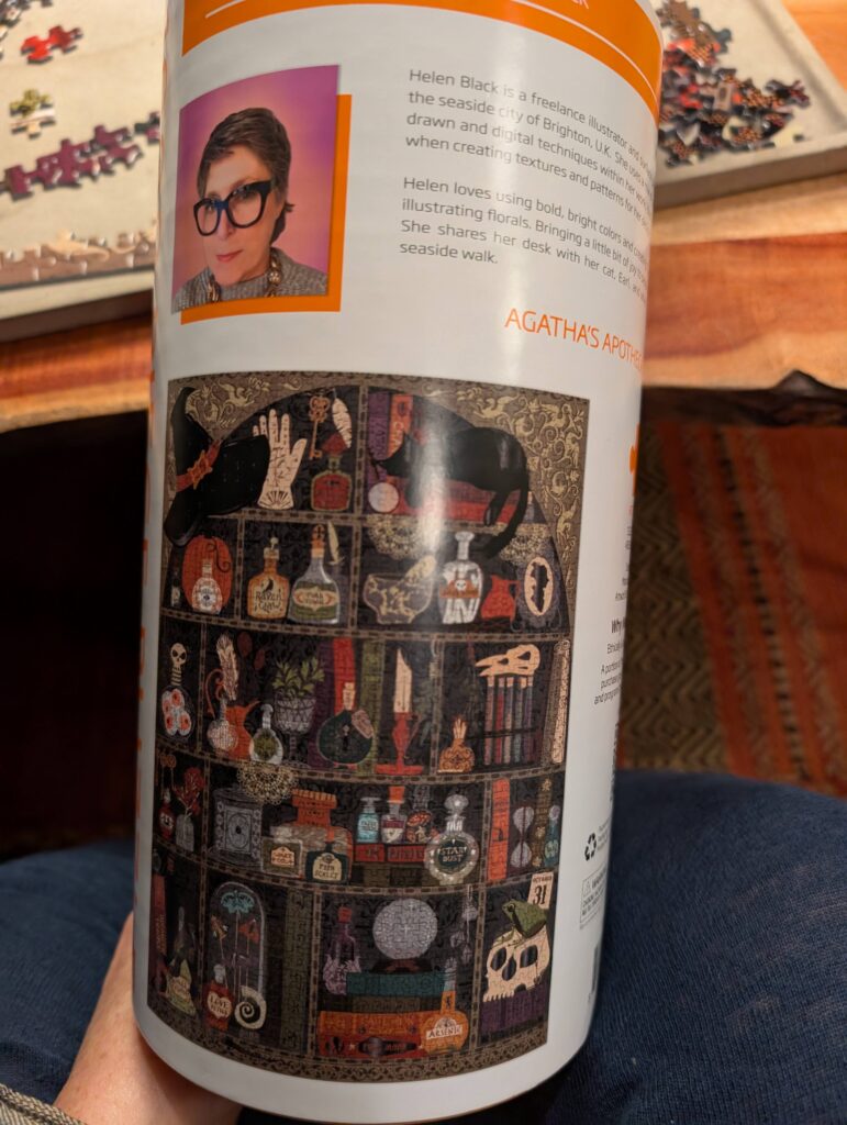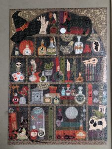 Another from my backlog (it will embarrassing to ultimately search all the posts with the word “backlog” — I went a little nuts in 2023-2024 in terms of buying puzzles!). This is from WerkShoppe, “Agatha’s Apothecary”, by Helen Black (Advocate-Art.com). The description says it’s “foil”, which I’m not quite sure what that means, but there are different textures and sheens in some of the patterns on the black hat. Which I now wish I had tried to photograph, but it’s all disassembled, so too late!