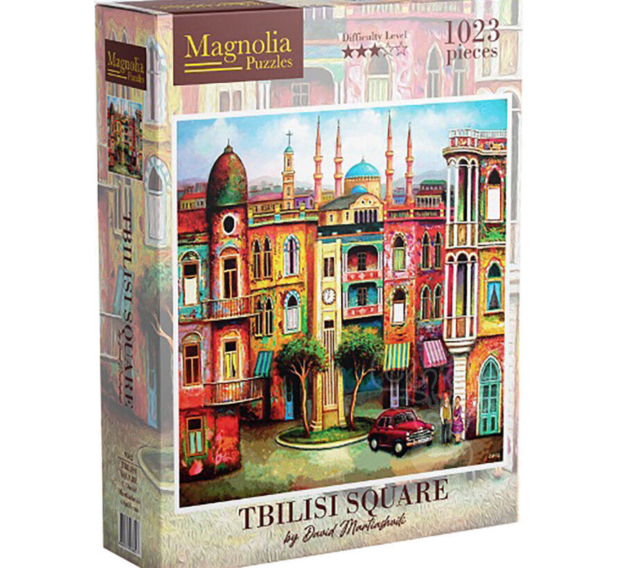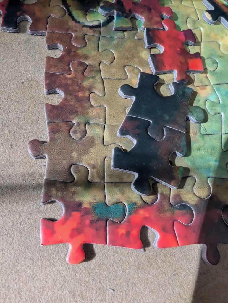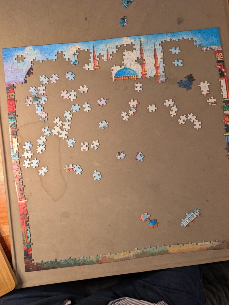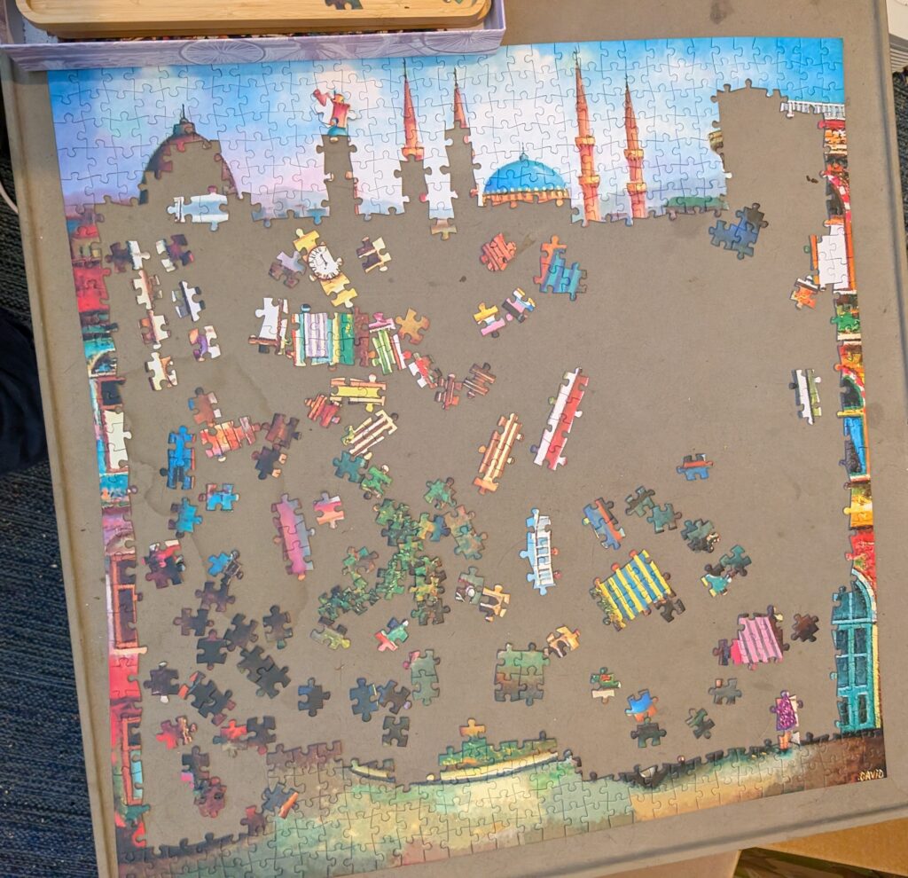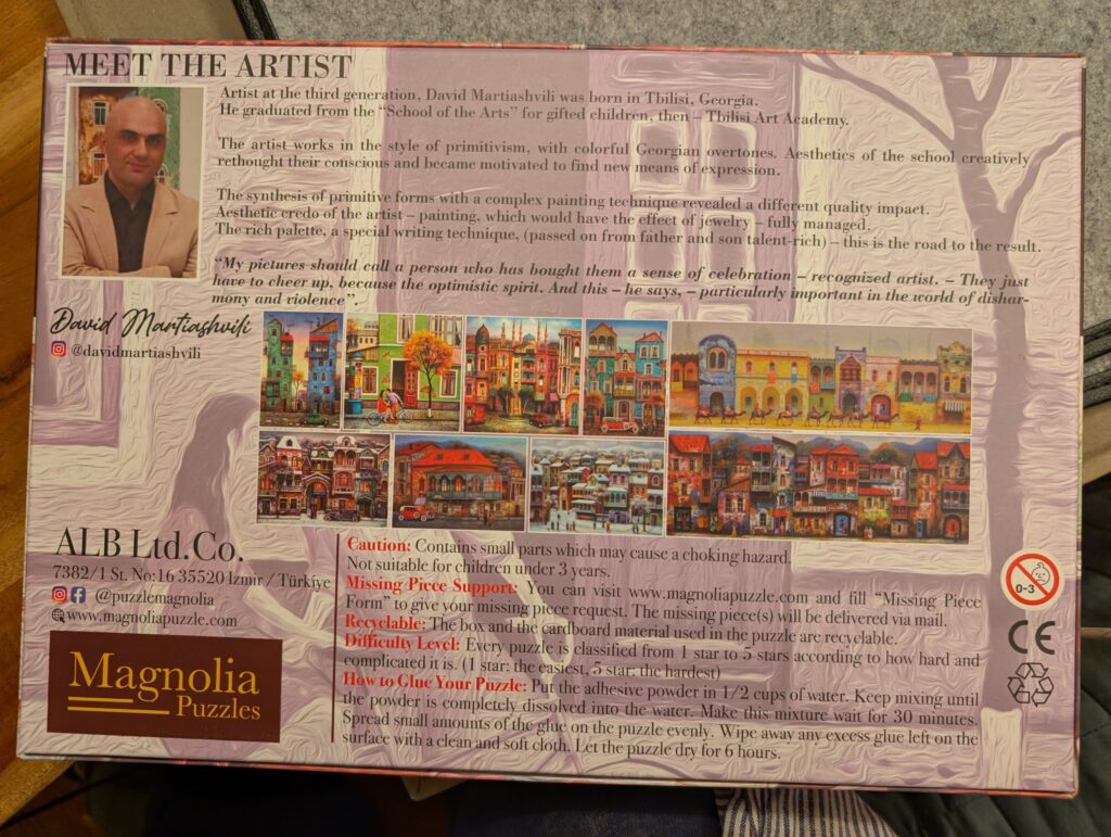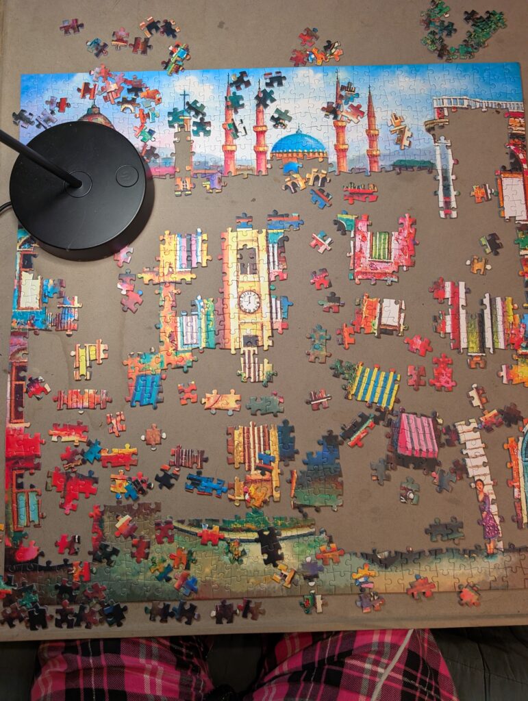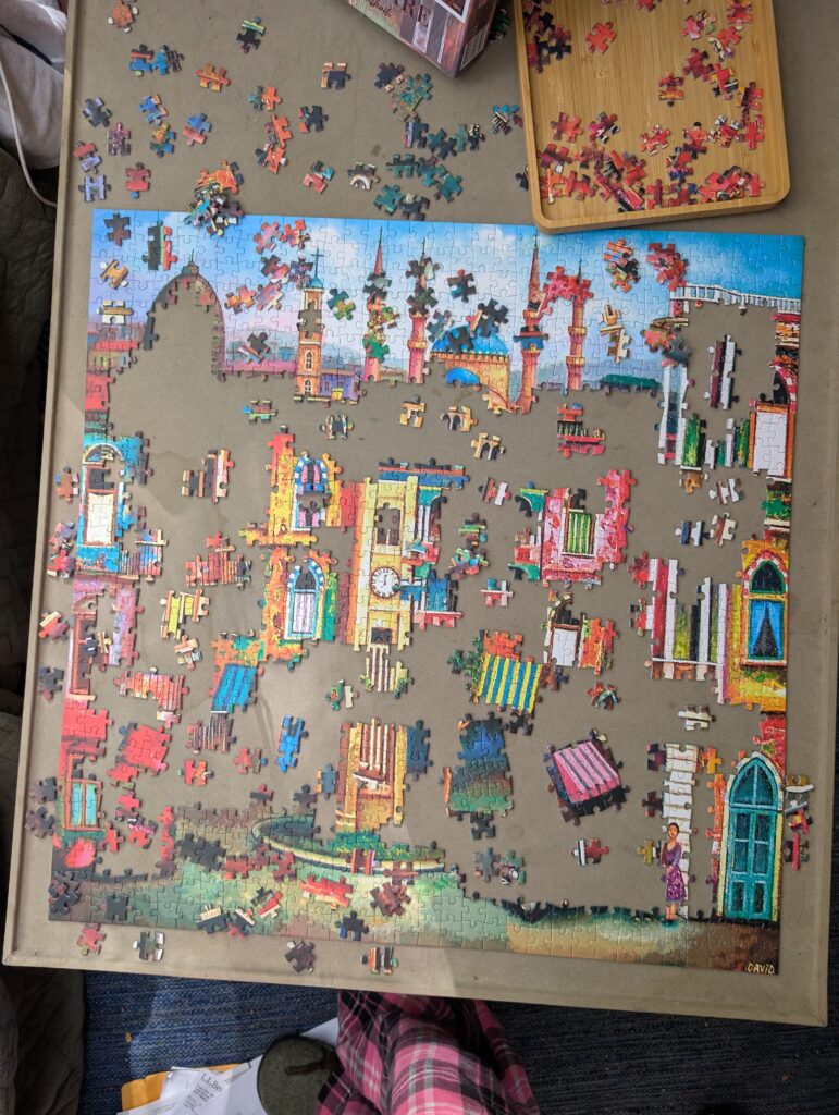 Loved the art, loved the puzzle — it was almost as “velvety” as Art & Fable. Really nice. The one problem is that the art print seemed sort of pixellated — as if it was imaged at a lower resolution. Disappointing! and made it a little difficult. But I did really love this puzzle. “Tbilisi Square” by David Martiashvili, Magnolia puzzles, 1023 pieces. … it’s very similar image to the “Harlequin Boardwalk” from yesterday but such a better made puzzle. …. Well, shit, also, I didn’t take a picture when I finished it, because it was night and the lamp-light made too much glare, I thought, although in retrospect it would probably have been okay because it was a pretty matte finish — but then in the middle of the night when I was awake with Ash, I ended up taking it apart, just sort of mindlessly … oops.