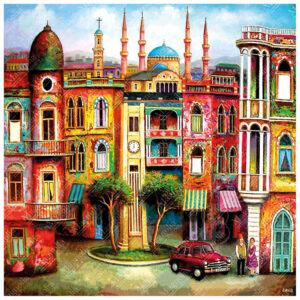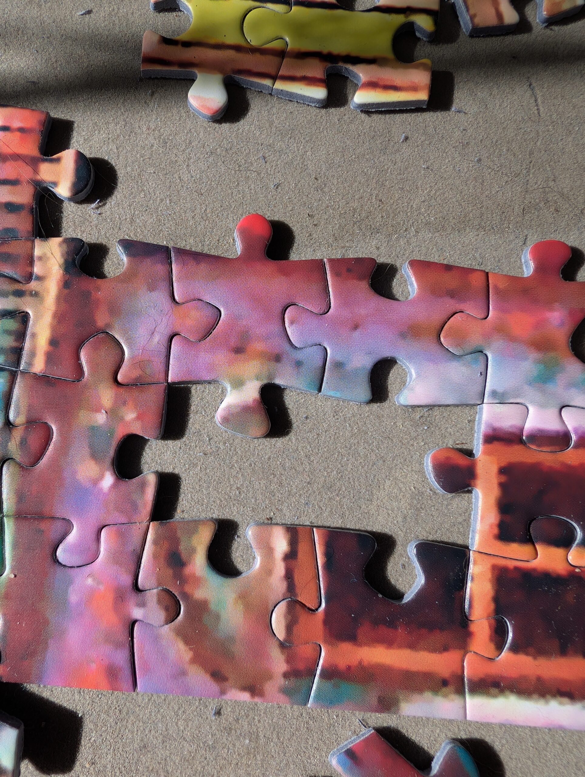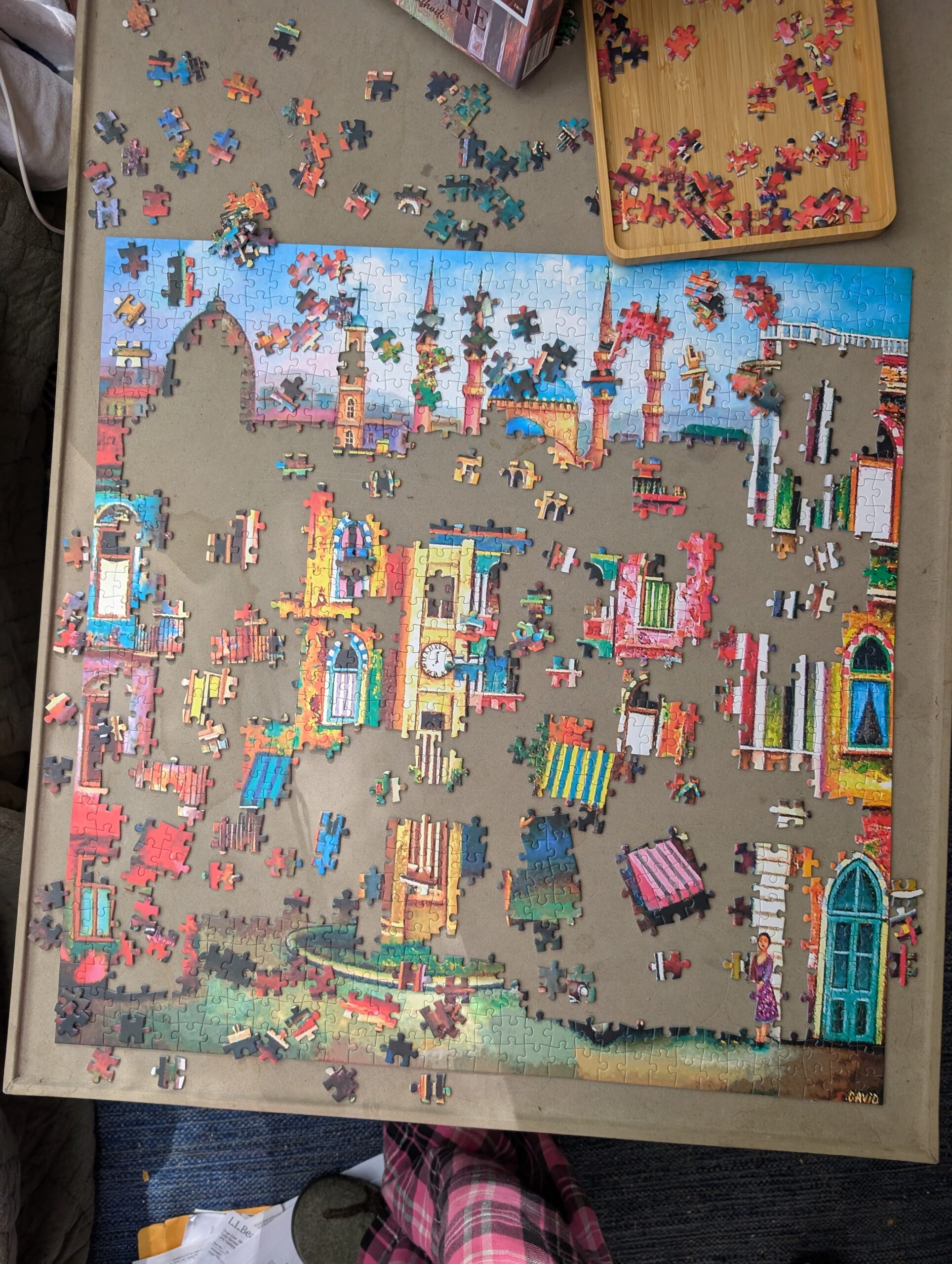 Loved the art, loved the puzzle — it was almost as “velvety” as Art & Fable. Really nice. The one problem is that the art print seemed sort of pixellated — as if it was imaged at a lower resolution. Disappointing! and made it a little difficult. But I did really love this puzzle. “Tbilisi Square” by David Martiashvili, Magnolia puzzles, 1023 pieces. … it’s very similar image to the “Harlequin Boardwalk” from yesterday but such a better made puzzle. …. Well, shit, also, I didn’t take a picture when I finished it, because it was night and the lamp-light made too much glare, I thought, although in retrospect it would probably have been okay because it was a pretty matte finish — but then in the middle of the night when I was awake with Ash, I ended up taking it apart, just sort of mindlessly … oops.