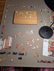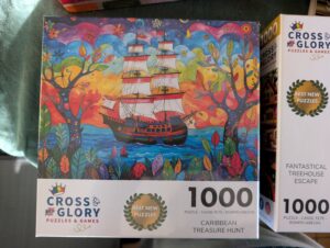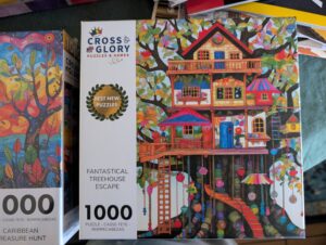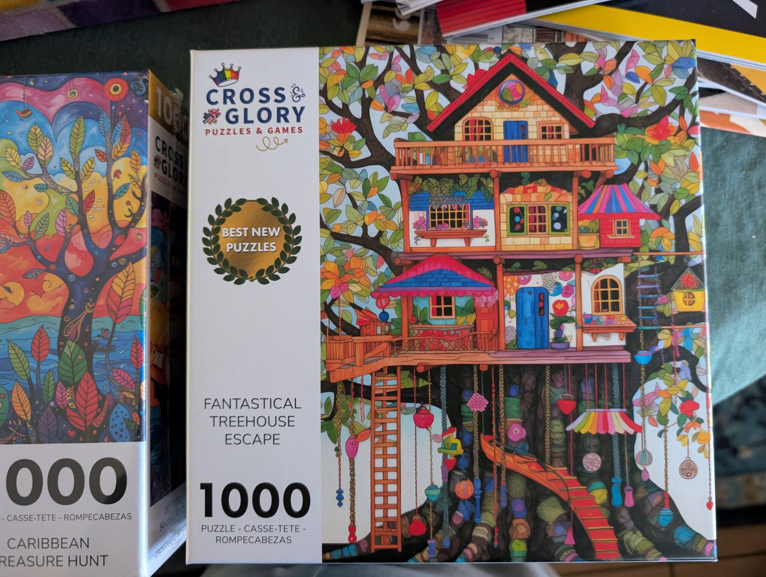 I couple of years ago I ran across “Cross & Glory” which, admittedly, had a bit of a scary name, but they said it was about England …. okay. The images were fun, and I bought three puzzles — “Petals & the Midnight Cat”, “Fantastical Treehouse Escape”, and “Caribbean Treasure Hunt”. When I got them I realized pretty quickly that they were AI-generated art, and I just could never make myself do them, so they filled out my backlog. Yesterday, I pulled out “Fantastical Treehouse Escape”, decided to do it and pass it on. The image is not a super easy solve, because of the numerous repeating elements. The puzzle quality is — well, it’s solveable, but not high quality. Thin crisp cardstock-like cardboard, with a very basic strip cut. I sorted, assembled most of the border, and began assembling elements, before heading to bed.