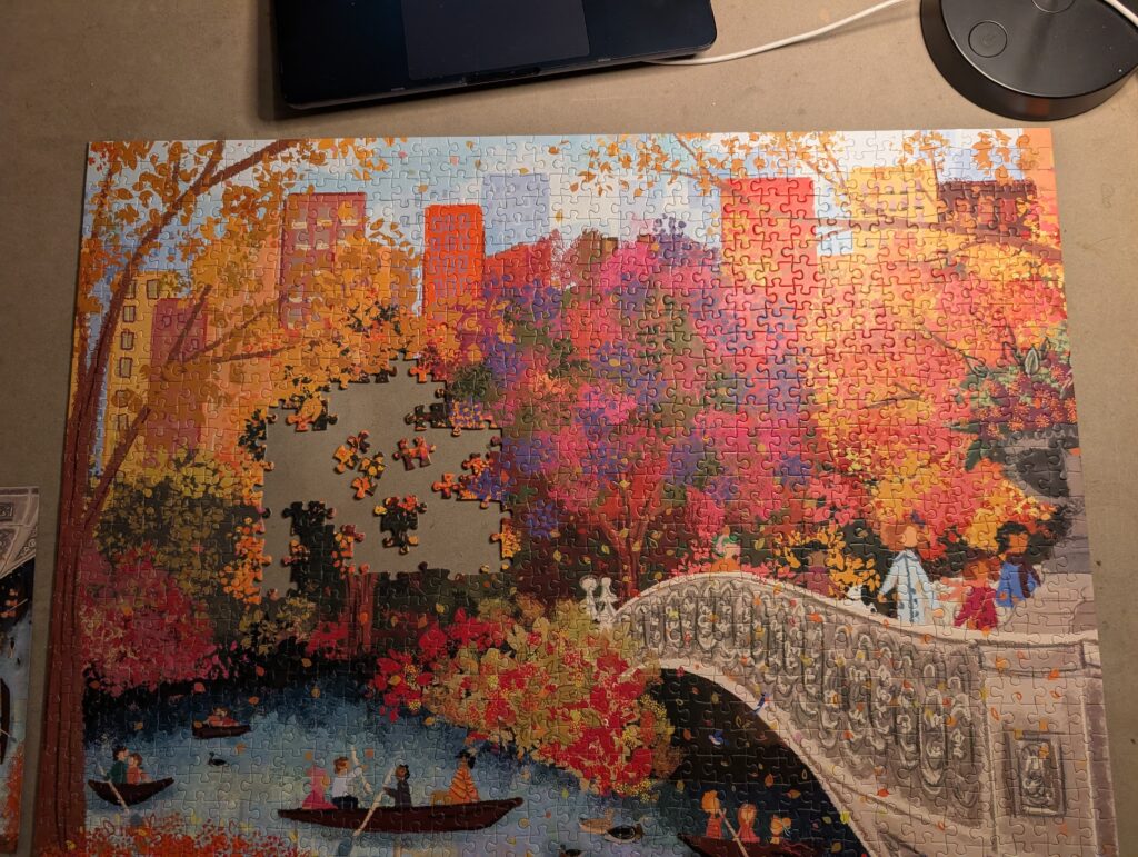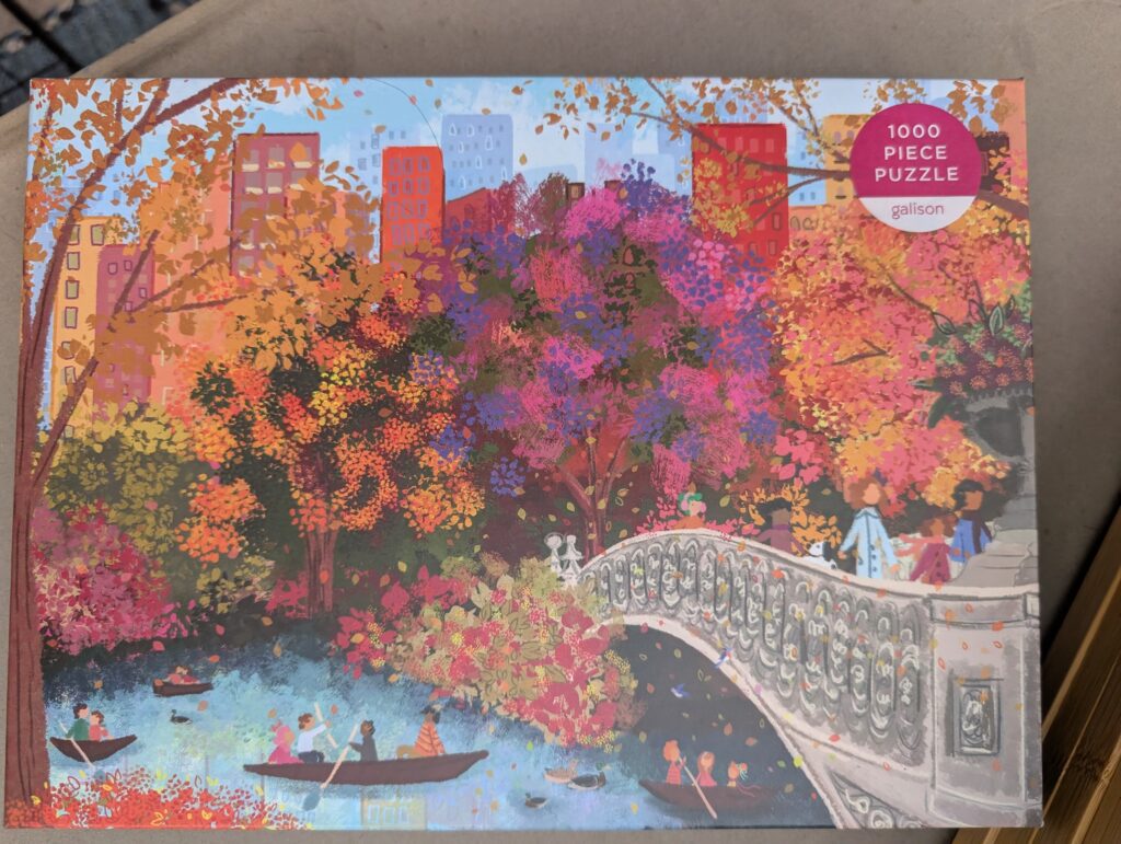 I was attracted by Joy LaForme’s “Autumn on Bow Bridge”, and I did enjoy assembling this piece … but oh, Galison, why did you make 1000 pieces of the ABAB puzzle shape? no ABBB or AABB or AAAA? aggghhh … also, there were a number of large-ish chunks that were still assembled! Cardboard was fully punched through, so they came apart cleanly.