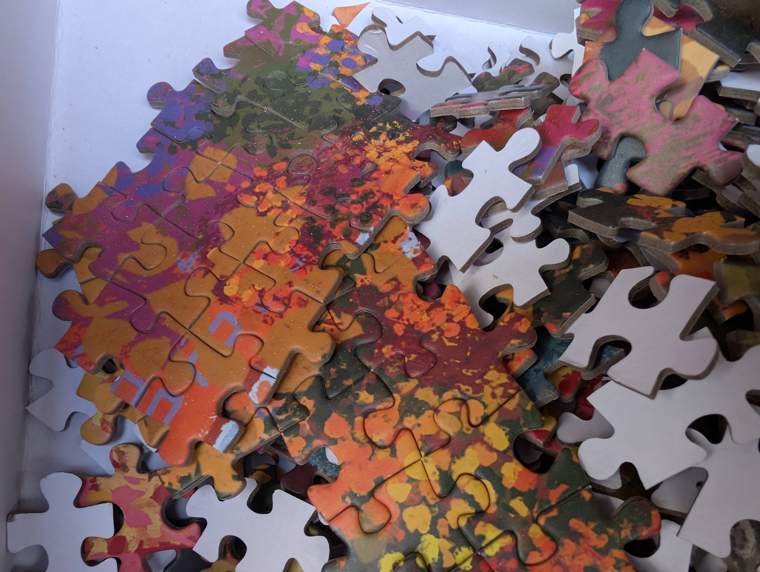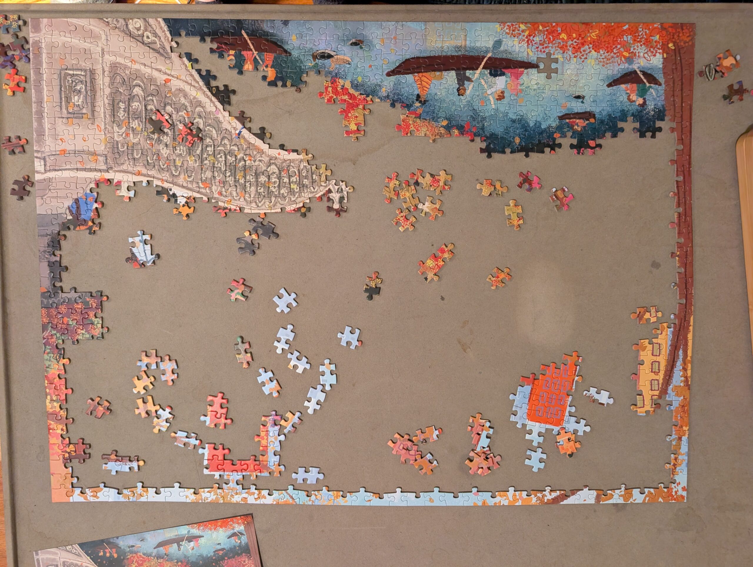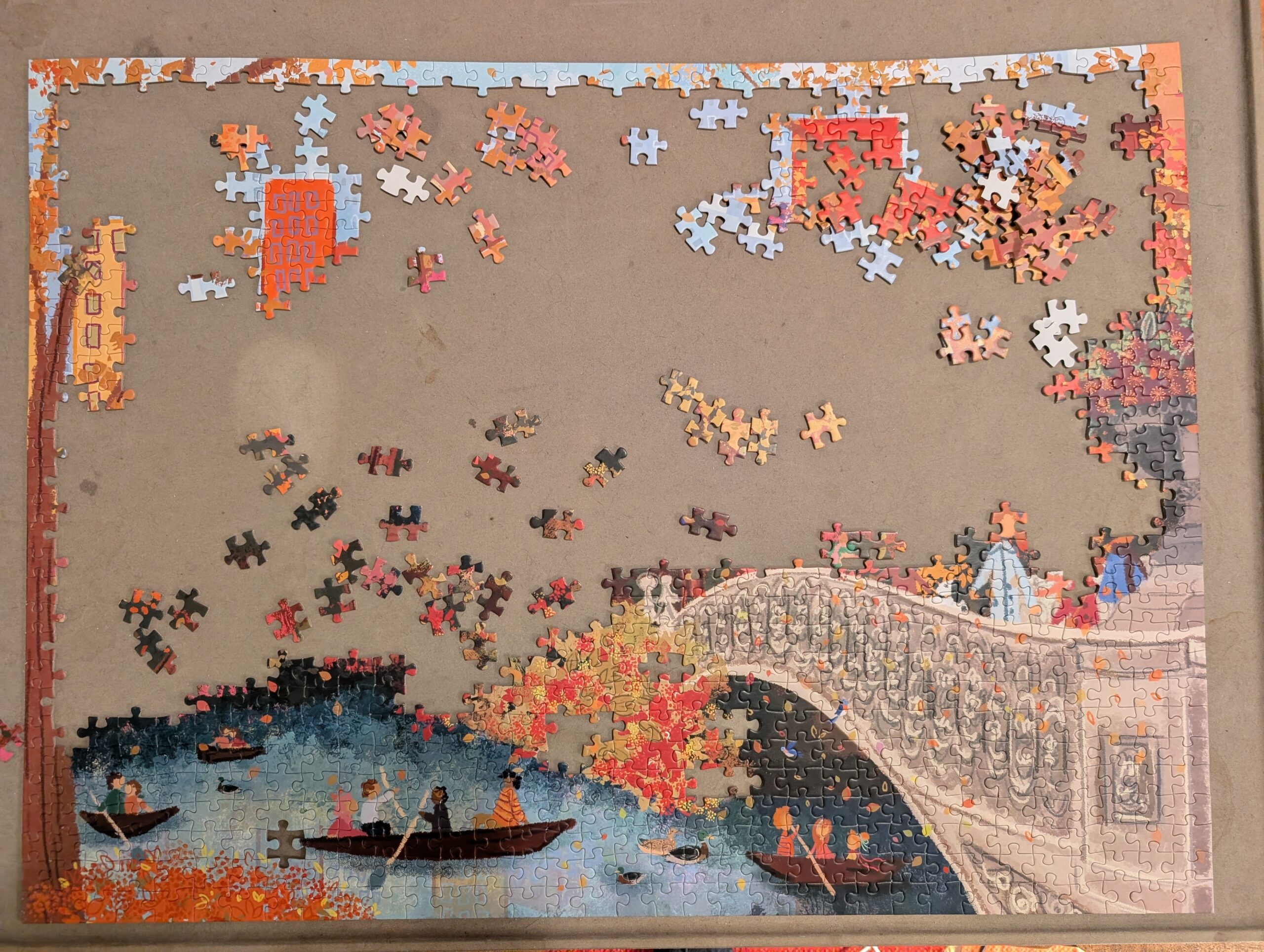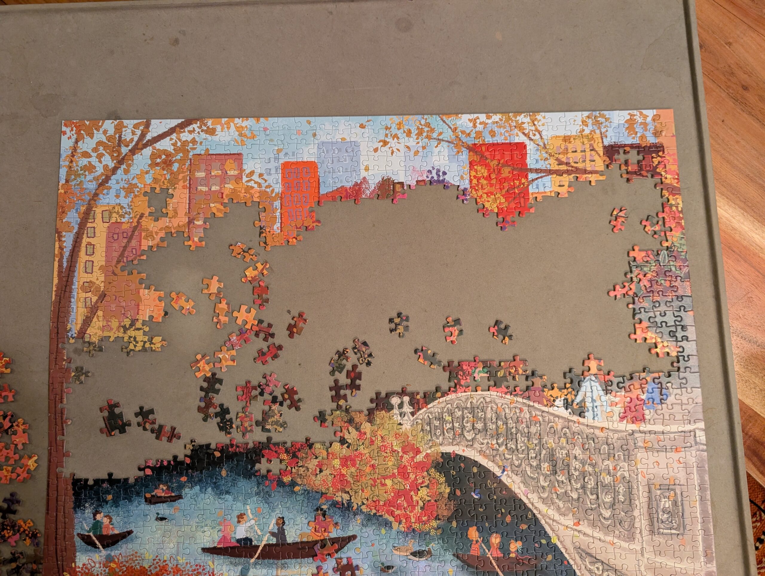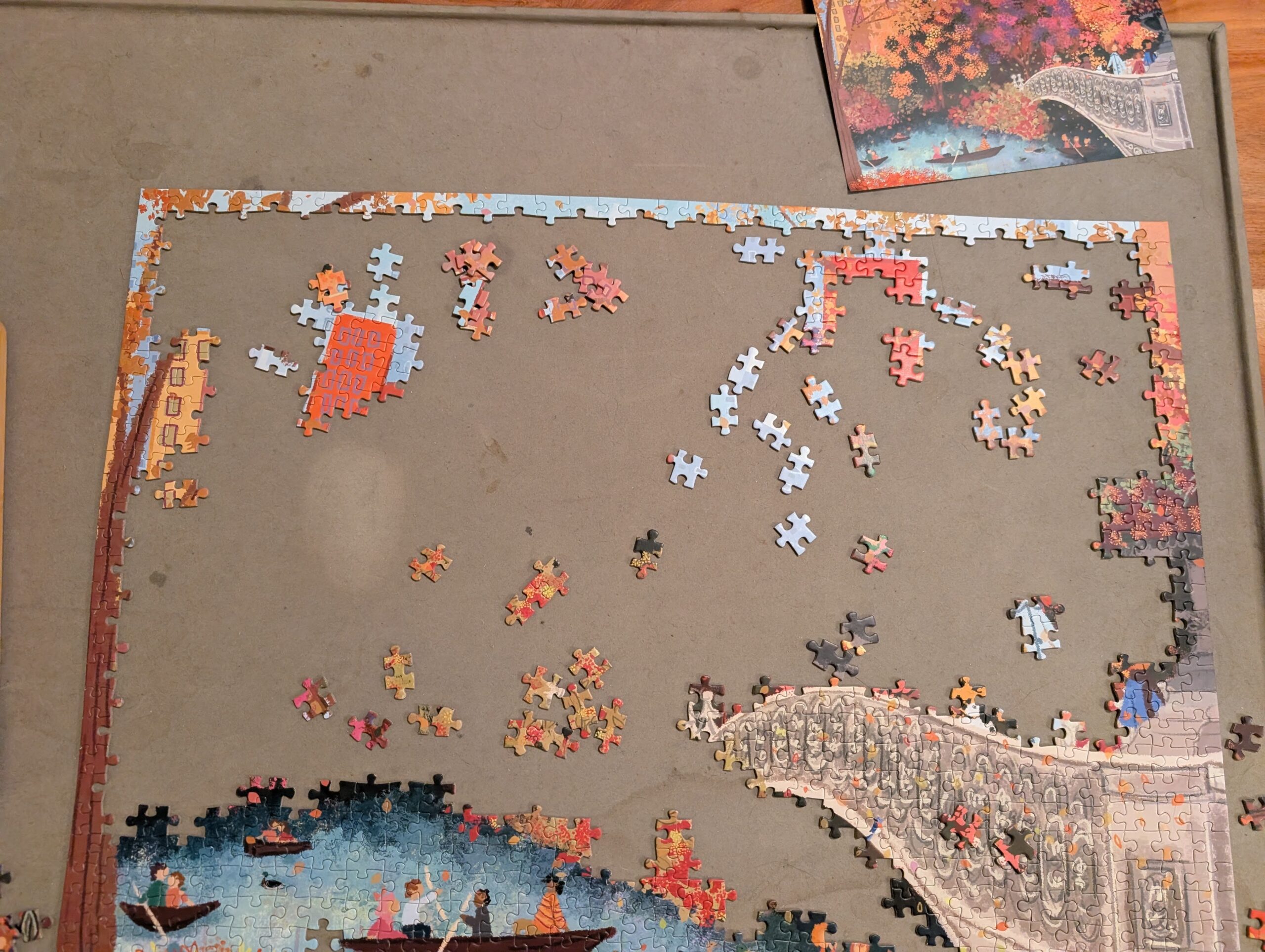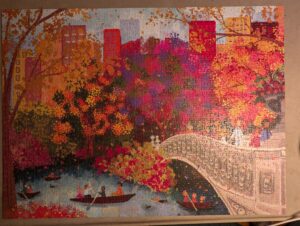 I was attracted by Joy LaForme’s “Autumn on Bow Bridge”, and I did enjoy assembling this piece … but oh, Galison, why did you make 1000 pieces of the ABAB puzzle shape? no ABBB or AABB or AAAA? aggghhh … also, there were a number of large-ish chunks that were still assembled! Cardboard was fully punched through, so they came apart cleanly.