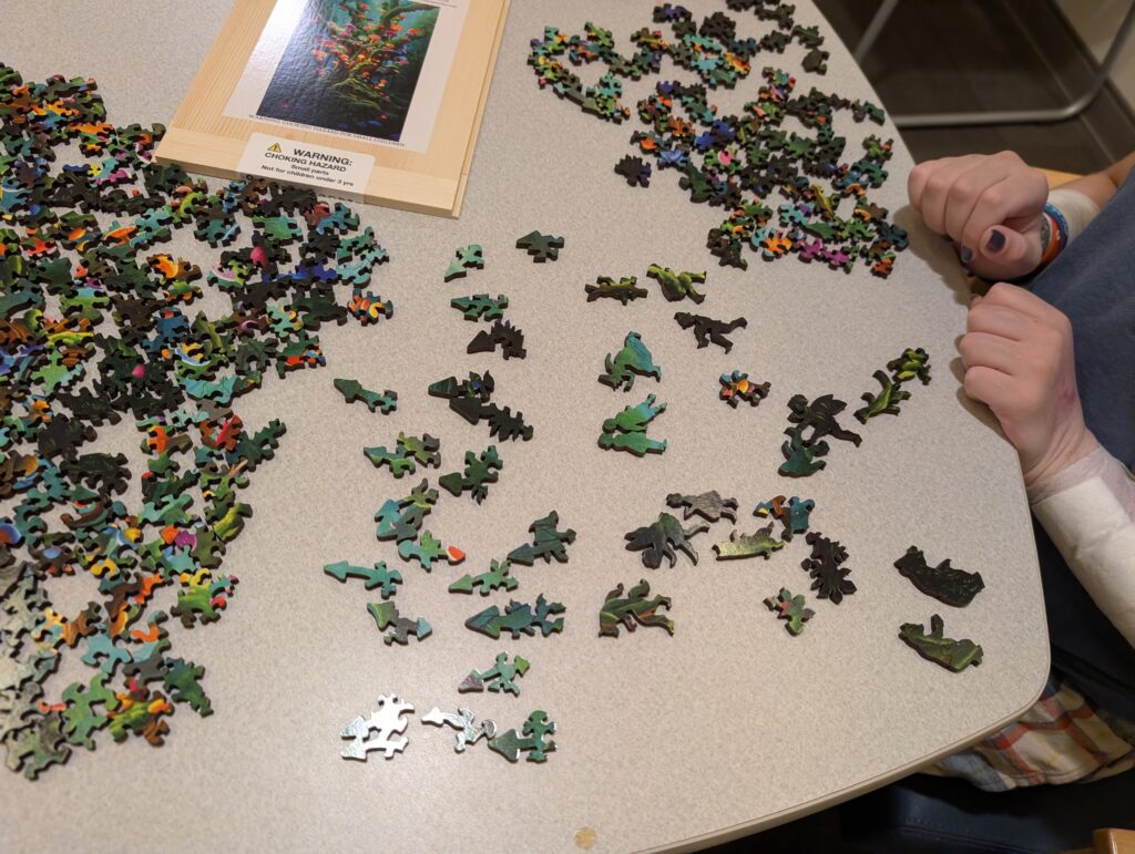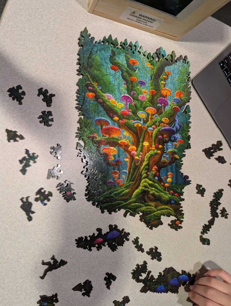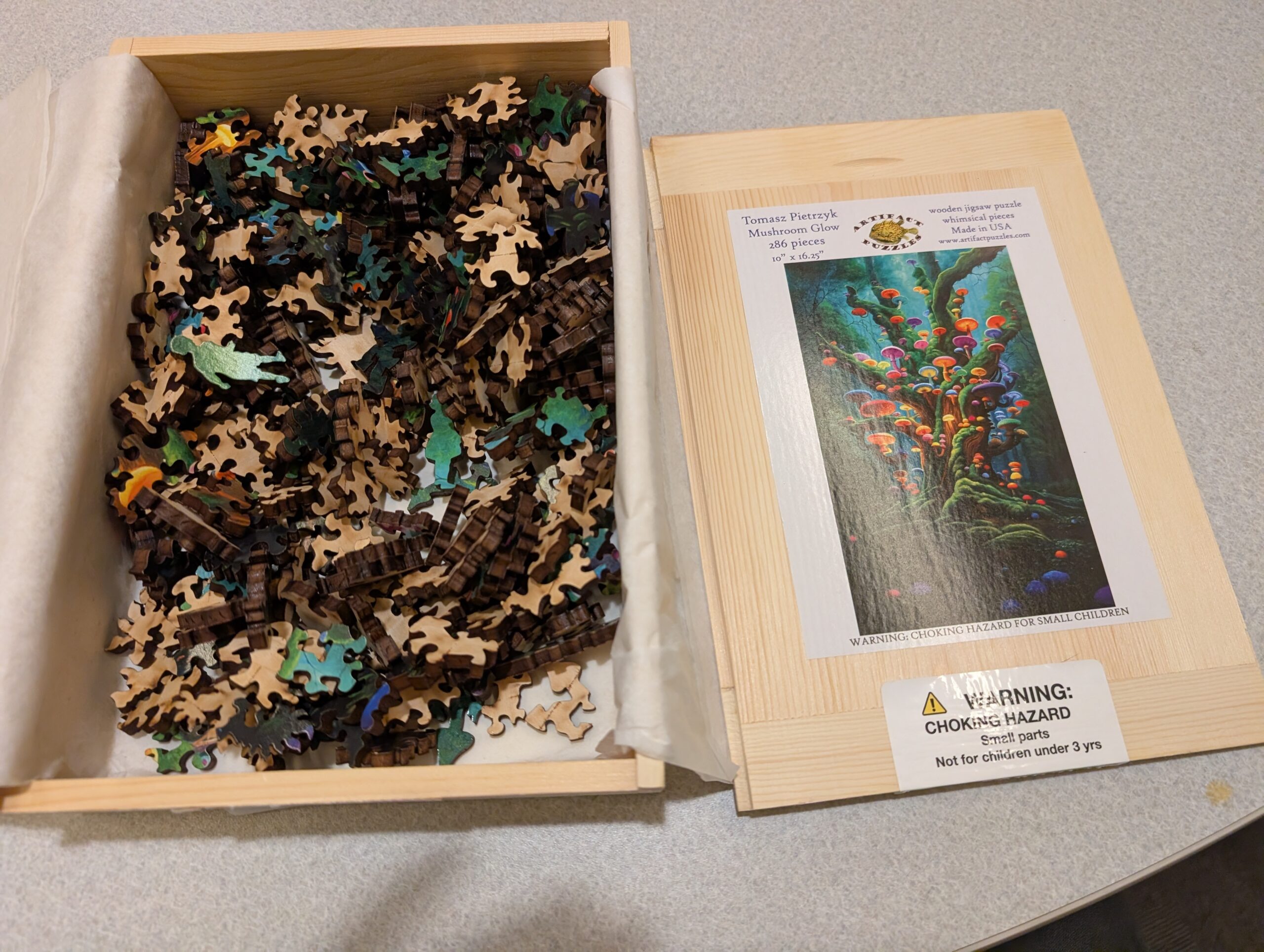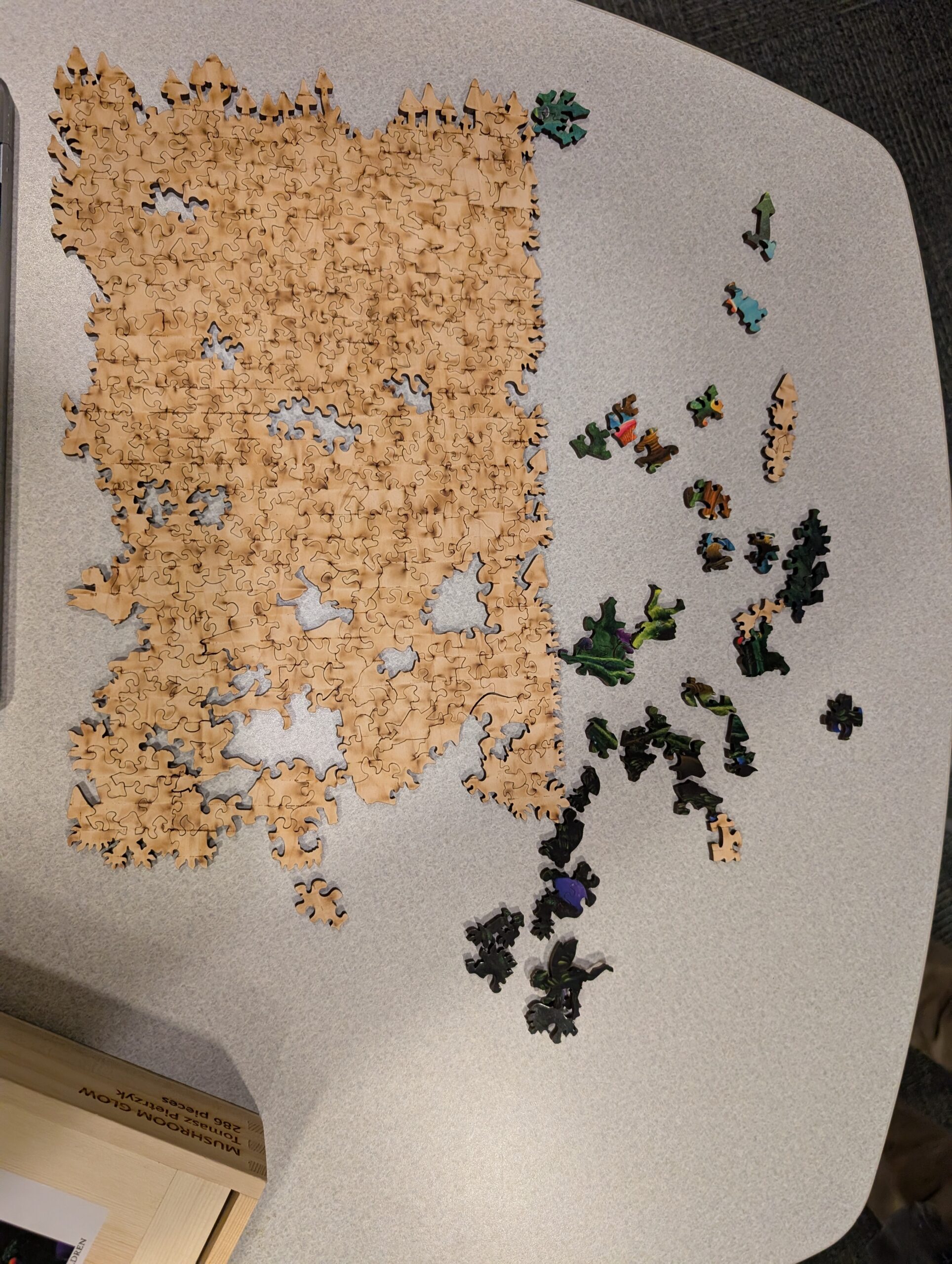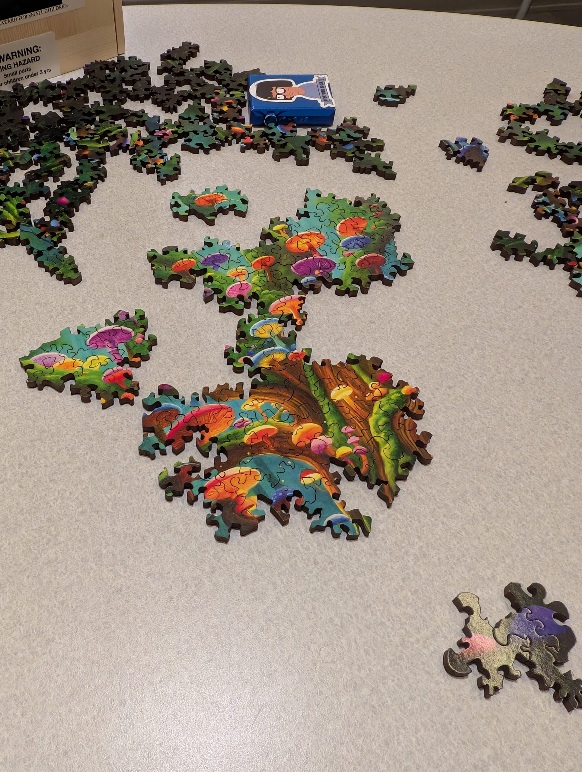 Ash and I did an Artifact 286-piece puzzle, “Mushroom Glow” by Tomasz Pietrzyk (https://www.tomekpietrzyk.art/en/), puzzle design by Matt Lyon. We broke into it last Tuesday (11/11) & got about halfway finished, then picked it up & finished it today. The bottom quarter of the puzzle was really challenging — pretty dark and hard with some glare. Puzzle description from Artifact: