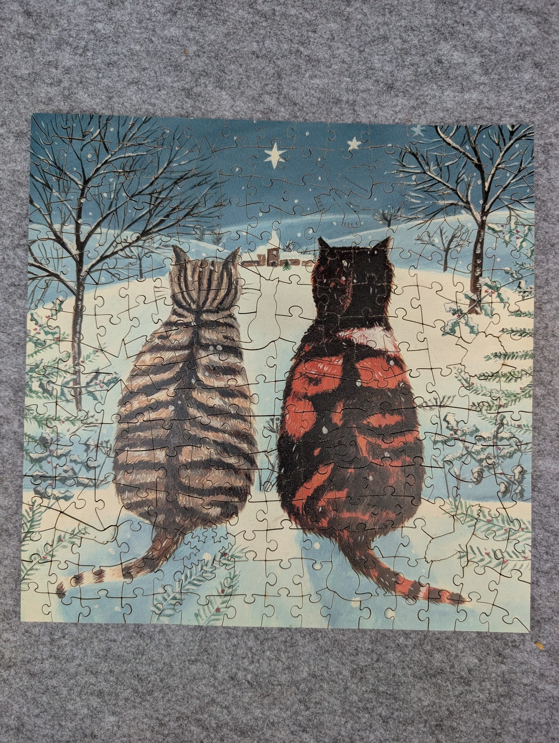 Wentworth Puzzles, 240 pieces, “Purr-fect Night” by Mary Stubberfield, via Hoefnagel. Another thin, MDF wood, mix of traditional pieces with etched whimsies. I liked this art better than the owl puzzle that was also in the Hoefnagel pack, but the puzzling experience otherwise was very similar.