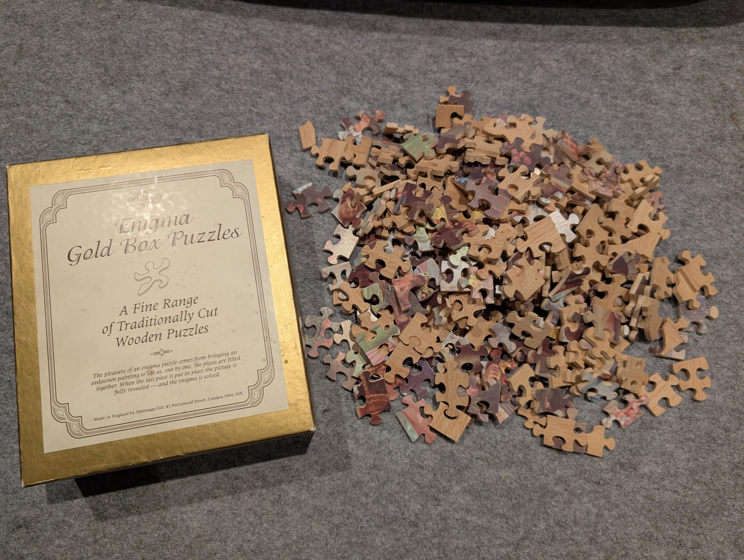 This 266-piece Optimago (1979-2005) puzzle is listed as an “Enigma”, with no image available. As with a lot of vintage puzzles, and puzzles made of old European art, the colors were a little bit muddy. They look a lot crisper in the photo than they did to my eyes! Maybe it’s my eyes that are […]