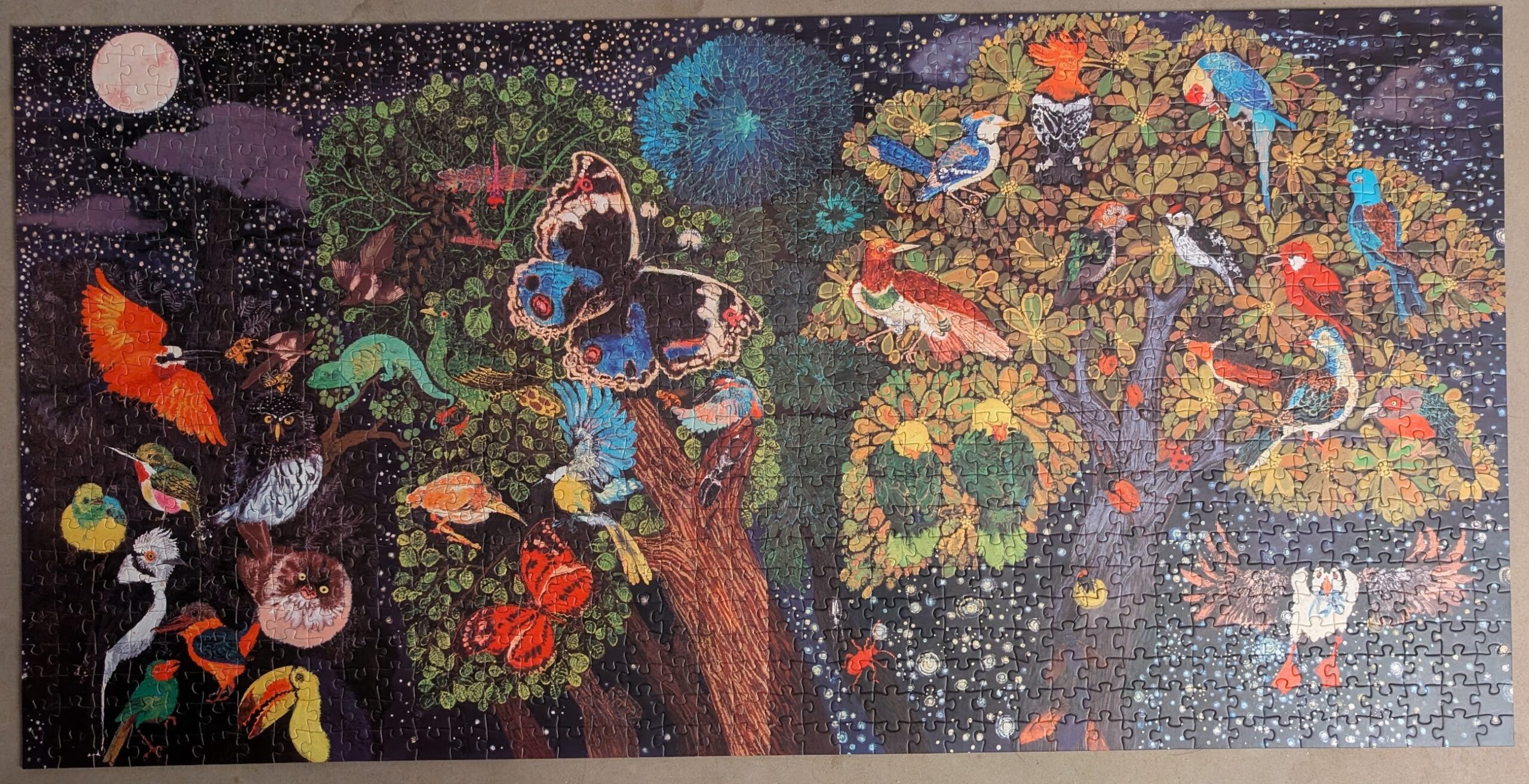 I’d had this 1000-piece puzzle (“Mid Summer Night Dream” by Enzhao Liu) from Antelope for a while, and was leery of doing it because it seemed dark and hard, but actually it came together very quickly and beautifully. There was lots of variation in the various birds and tree forms, and even the night sky […]